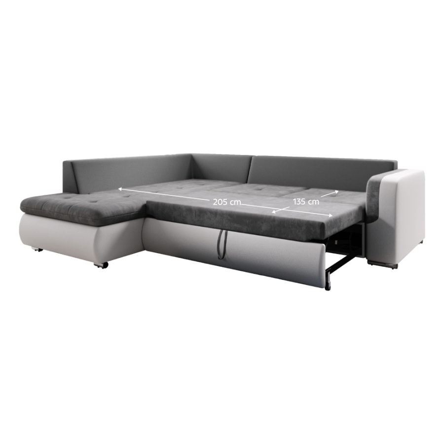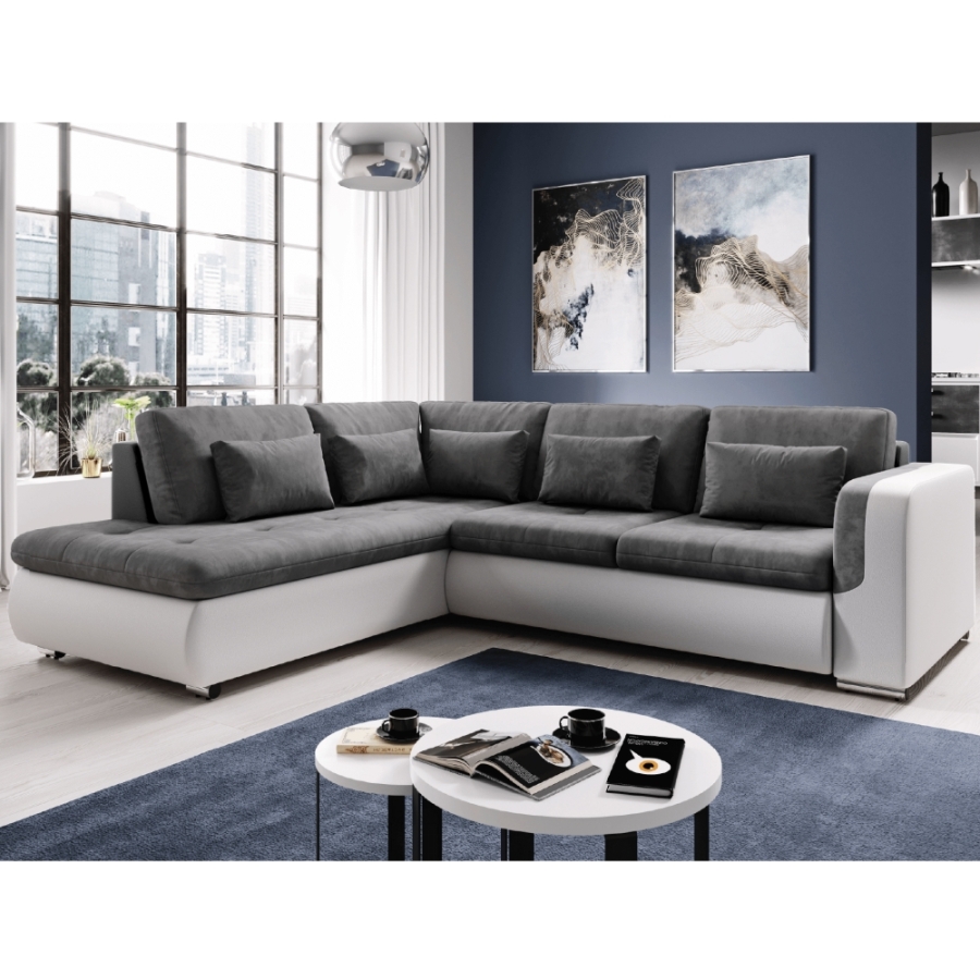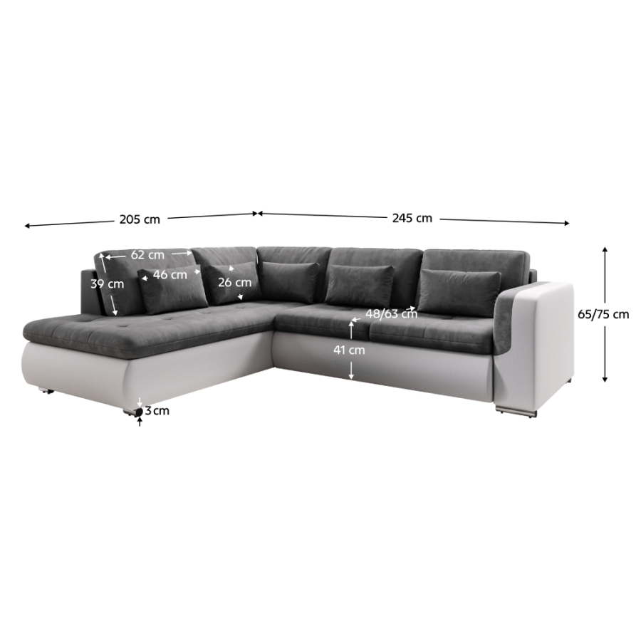 Anyag: ekobőr/szövet Seal 96 Az ekobőr kopásállósága a Martindale teszt szerint: 100 000 ciklus A szövet kopásállósága a Martindale teszt szerint: 80 000 ciklus Szín: fehér/szürke Méretek (SzxMéxMa): 245x205x65/75 cm Ülés magassága: 41 cm Ülés mélysége: 48/63 cm Az alsó tér magassága a padlótól: 3 cm Kinyitható Alvófelület (SzxHo): 135x205 cm Sarok Töltet: Falista rugó/pur hab Műanyag lábak Lábak színe: ezüst Teljesen kárpitozott Vízálló anyag Balos kivitelezés Párnákkal szállítva 5 nagy párna 5 díszpárna Nagy párna méretei (SzxMa): 62x39 cm Kis párna méretei (SzxMa): 46x26 cm Szétszerelve szállítva A kanapét megrendelheti az ekobőr 4 színváltozatában és a Seal szövet 7 színváltozatban ár 382 500 Ft. Egyedi megrendelés esetén az összeg 10%-át előlegként szükséges befizetni. Az előleg befizetése után a megrendelése gyártásba kerül. A szállítási idő 6-8 hét.