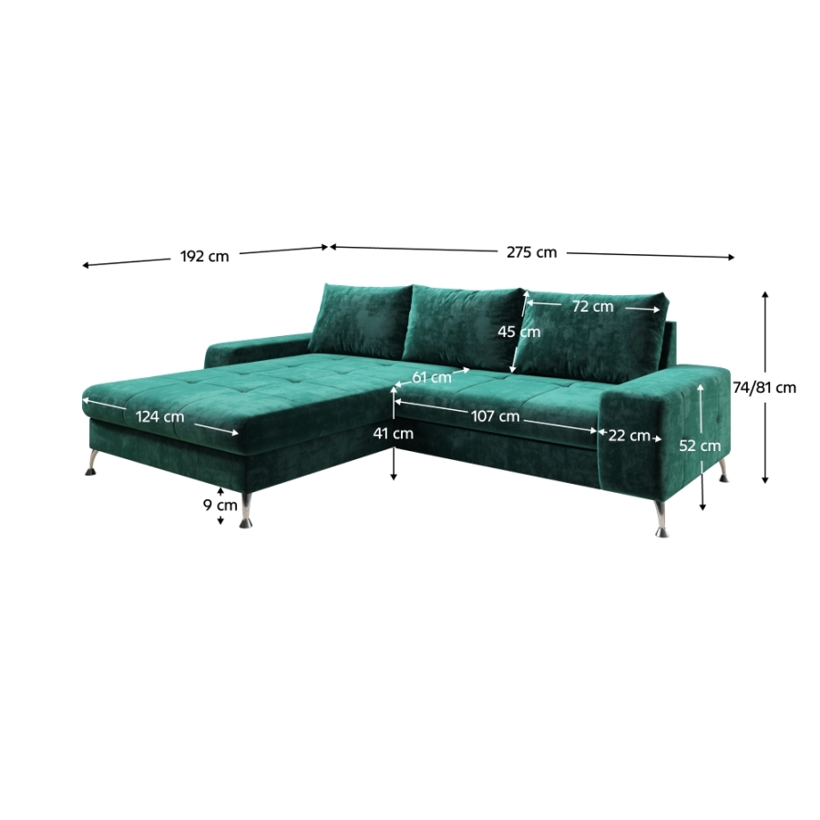 Anyag: szövet Monolith 37 A szövet kopásállósága a Martindale teszt szerint: 100 000 ciklus Szín: smaragd Méretek (SzxMéxMa): 275x192x74/81 cm Ülés magassága: 41 cm Ülés mélysége: 61 cm Az alsó tér magassága a padlótól: 9 cm Kihúzható Alvófelület (SzxHo): 145x220 cm Teherbírás/személy: 90 kg Sarok Tárhellyel Dekoratív steppelés Töltet: falista rugó/purhab Fém lábakon áll Lábak színe: króm Teljesen kárpitozott Balos kivitelezés Párnákkal szállítva Szétszerelve szállítva A kanapét a Monolith szövet 7 színváltozatában megvásárolhatja ár 389 900 Ft. Egyedi megrendelés esetén a teljes összeg 10%-át előlegként szükséges kifizetni. Az előleg kifizetése után a megrendelése gyártásba kerül. A szállítási idő 6-8 hét.