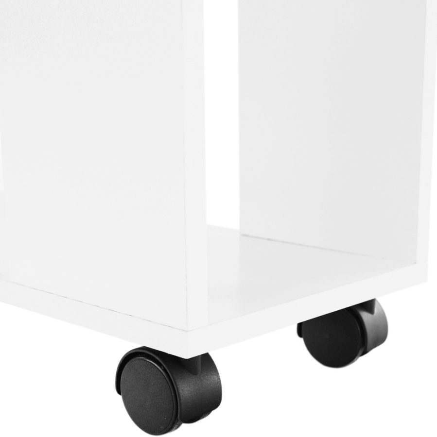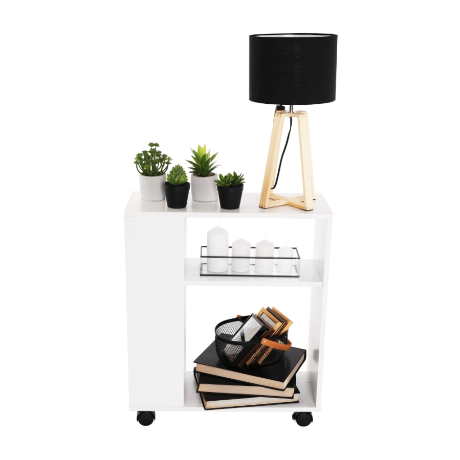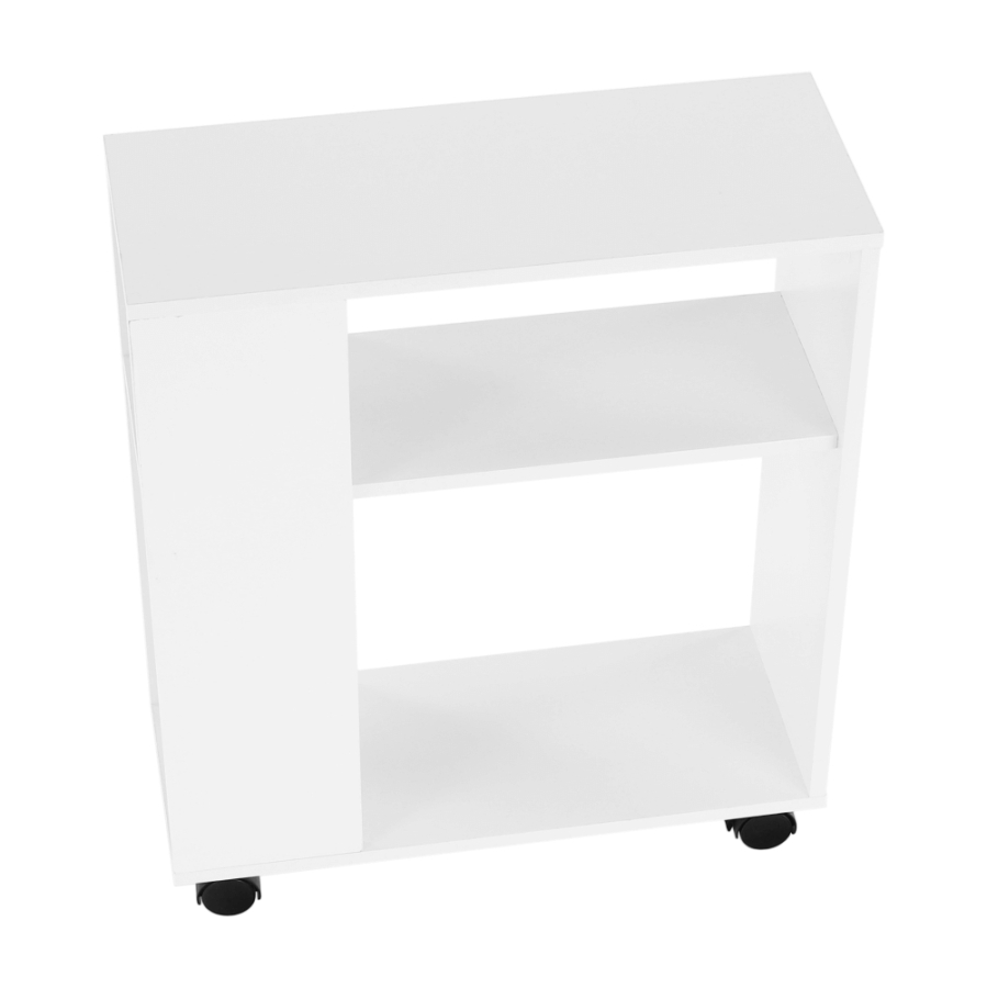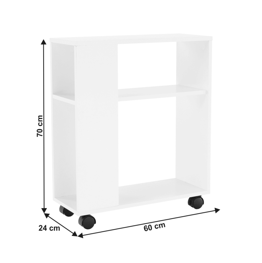 "Kisasztal kerekekkel, fehér színben. Méretek (SzéxMéxMa): 60x24x70 cm Anyag vastagsága: 15 mm"
