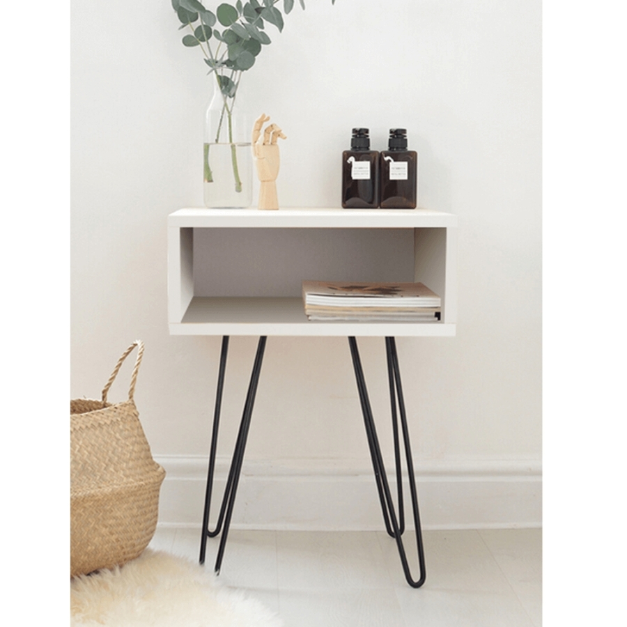 Anyag: MDF /fém Szín: fehér/fekete Méretek (SzxMéxMa): 45x35x58 cm Nyitott tárolóval Kisasztal Éjjeliszekrény Szétszerelve szállítjuk