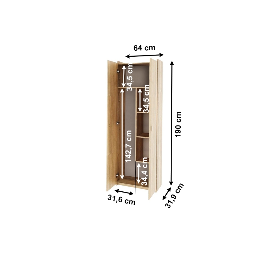 Kombinált szekrény 3 polccal, NATALI 6 Szín: sonoma tölgy Anyag: laminált DTD Méretek (SzéxMéxMa): 64x31,9x190 cm Minden polc magassága: 34,5 cm Magasság az alsó polcig: 34,4 cm Magasság a felső polcig: 142,7 cm Anyagvastagság: 16 mm Lapraszerelten szállítva Szlovák termék
