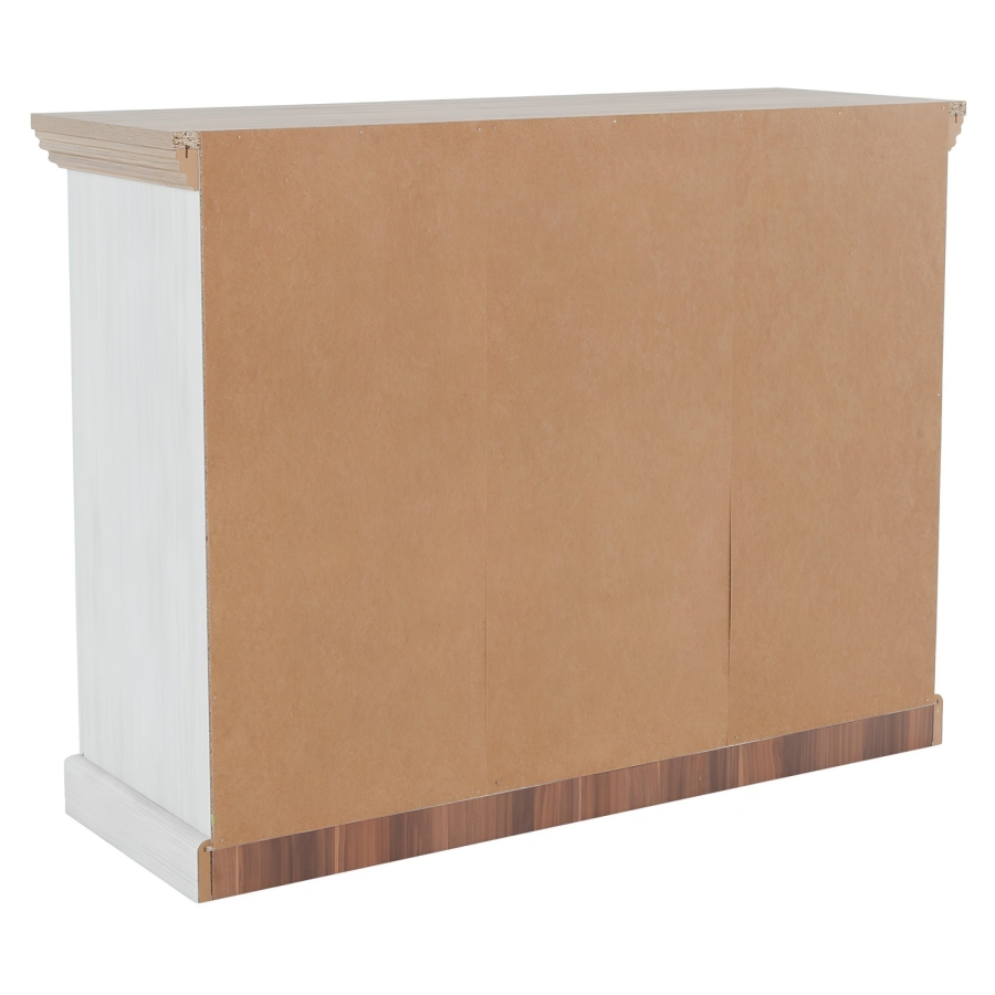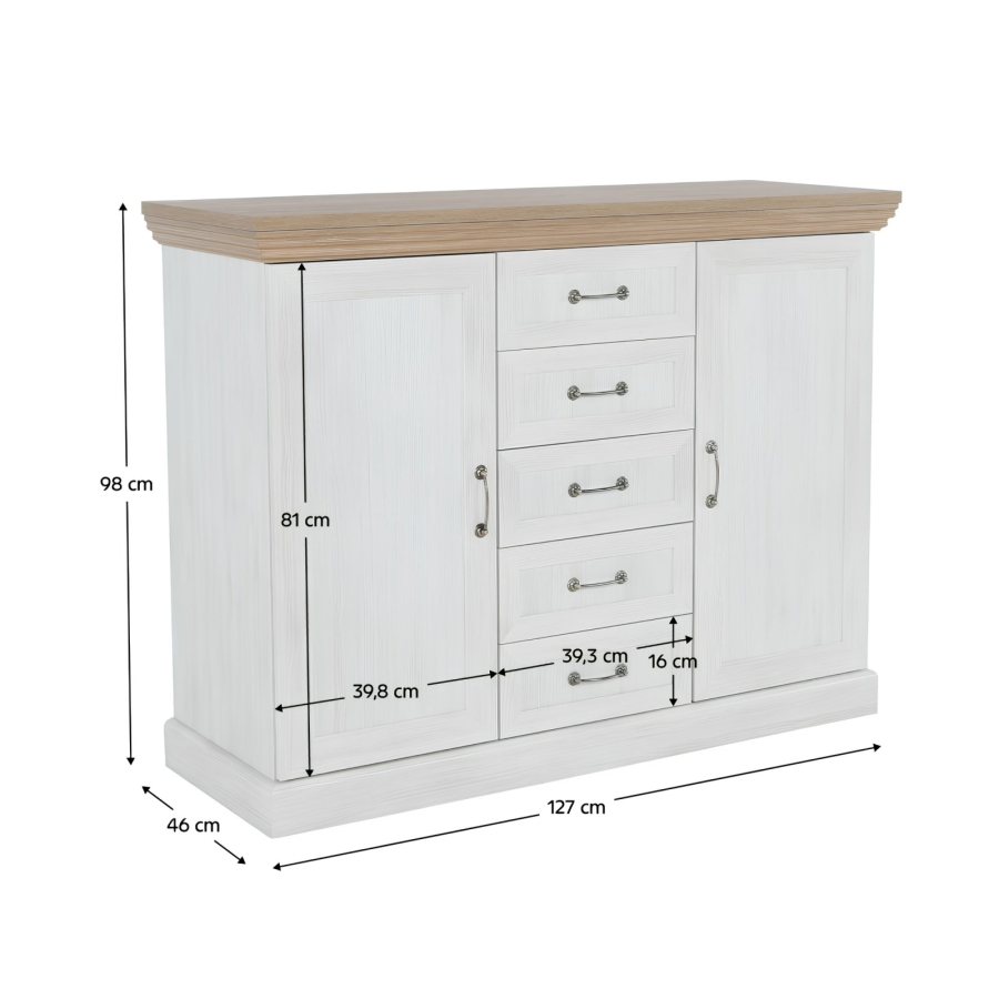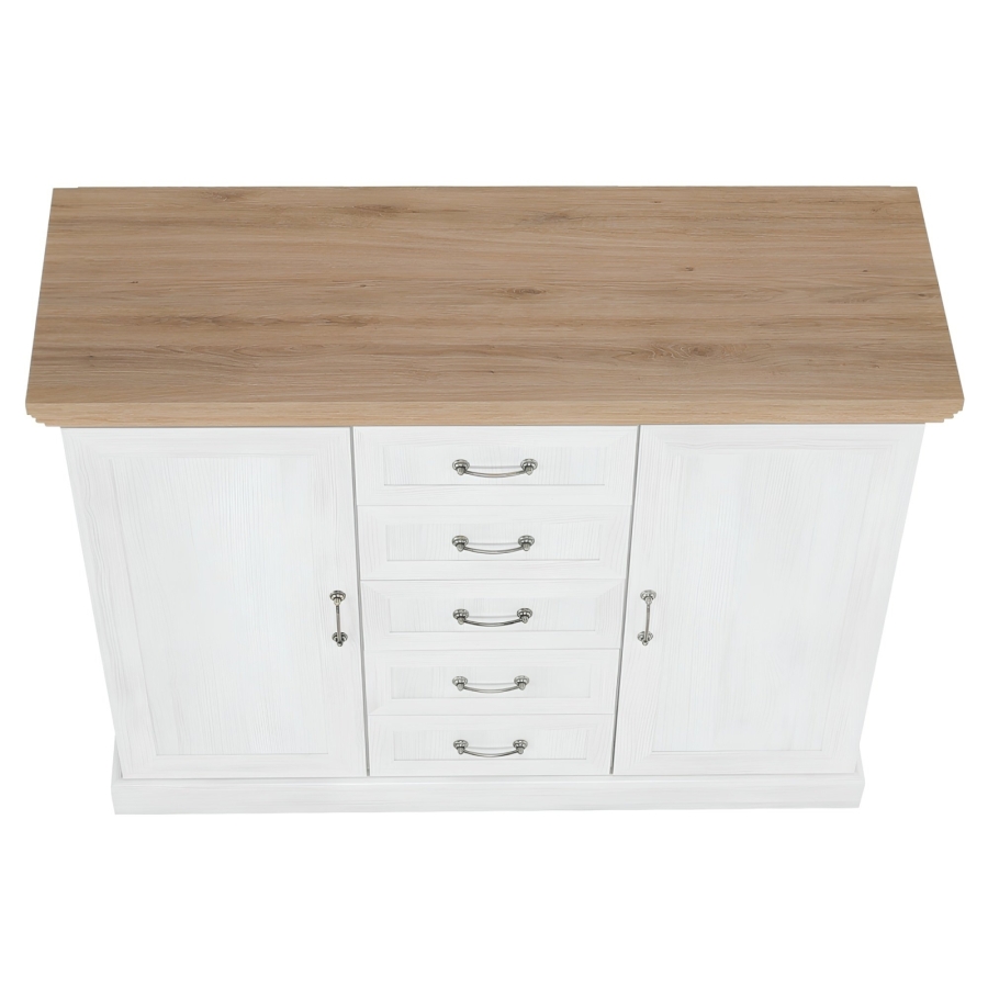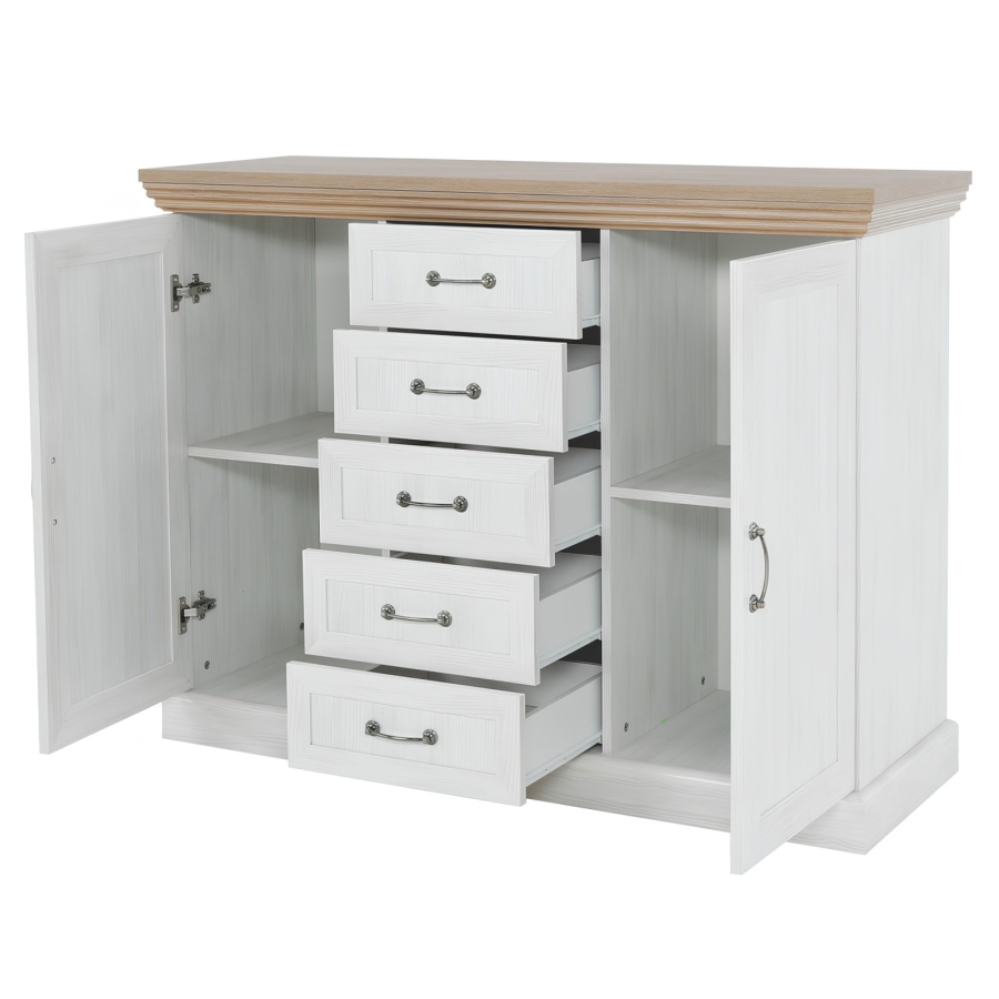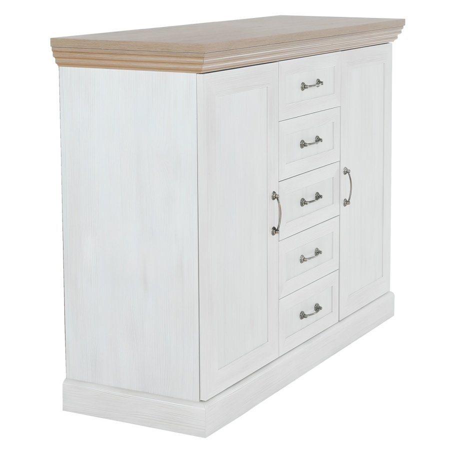 Kétajtós komód K2D öt fiókkal az elegáns provence stílusú ROYAL elemes bútorcsaládból Ideális nappaliba vagy hálószobába. Anyag: váz laminált DTD + díszlécek, fém fogantyúk Színváltozat: északi fenyő/vadtölgy Méretek (SzéxMéxMa): 127x46x98 cm Váz vastagsága: 15 mm Felsőlap vastagsága: 22 mm Szállítás: lapraszerelten