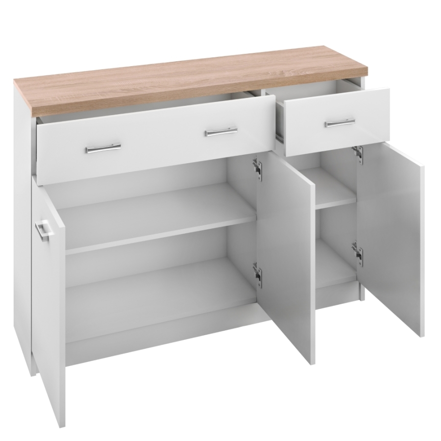 Komód 3D2S TOPTY Typ 07 Anyag: laminált DTD Változat: fehér/sonoma tölgy Méretek (SzéxMéxMa): 120x33x85 cm Váz vastagsága: 16 mm Felső lap vastagsága: 32 mm A modern elemes rendszer alkalmas az irodába, dolgozószobába, nappaliba vagy az előszobába"