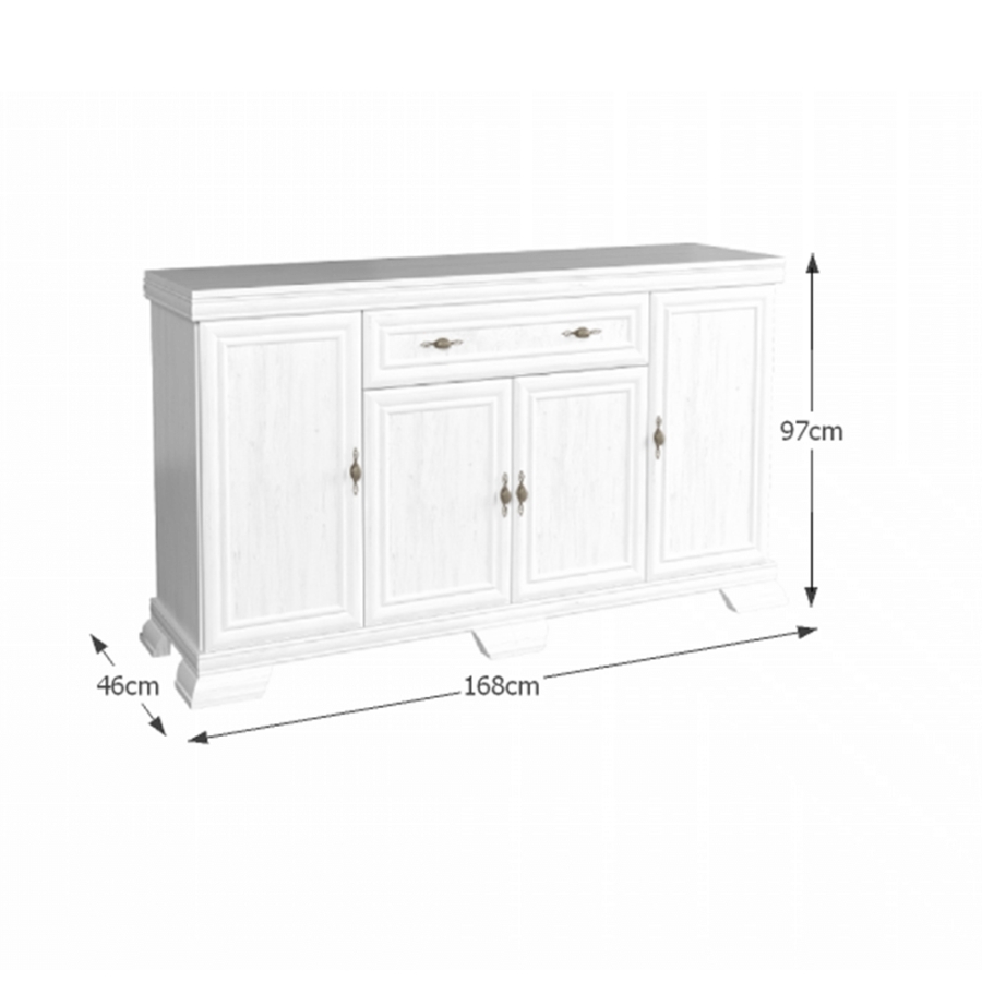 Komód, KORA KK4 Színváltozat: andersen fenyő Anyag: laminált DTD, MDF, fém Méretek (SzéxMéxMa): 168x46x97 cm Az alsó tér magassága a padlótól: 10,5 cm