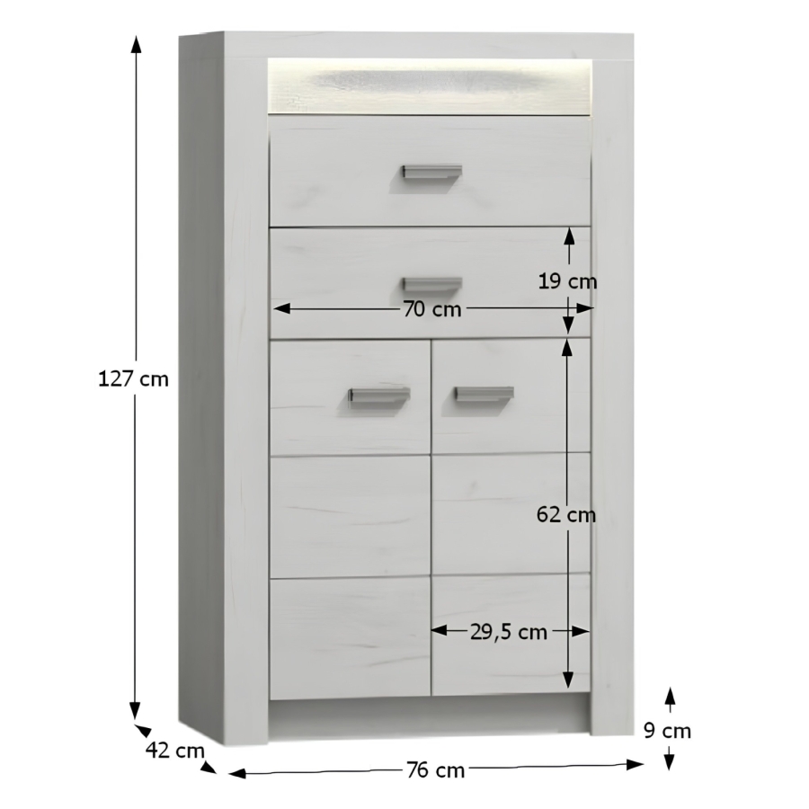Komód Infinity I-06 Váz vastagsága: 48 mm, fém fogantyúk Anyag: laminált DTD, ABS élek Színváltozat: fehér kőris Méretek (SzéxMéxMa): 76x42x127 cm LED világítás hozzárendelhető Szétszerelt állapotban szállítjuk