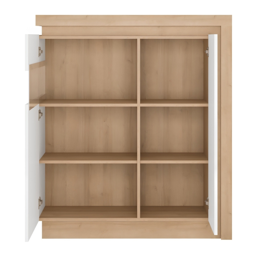 Komód LYOV04L a LEONARDO elemes bútorból riviera tölgy/fehér magasfényű változatban. Méretek (SzéxMéxMa): 107x42x124 cm Csendes ajtócsukódási rendszer Szállítás szétszerelve
