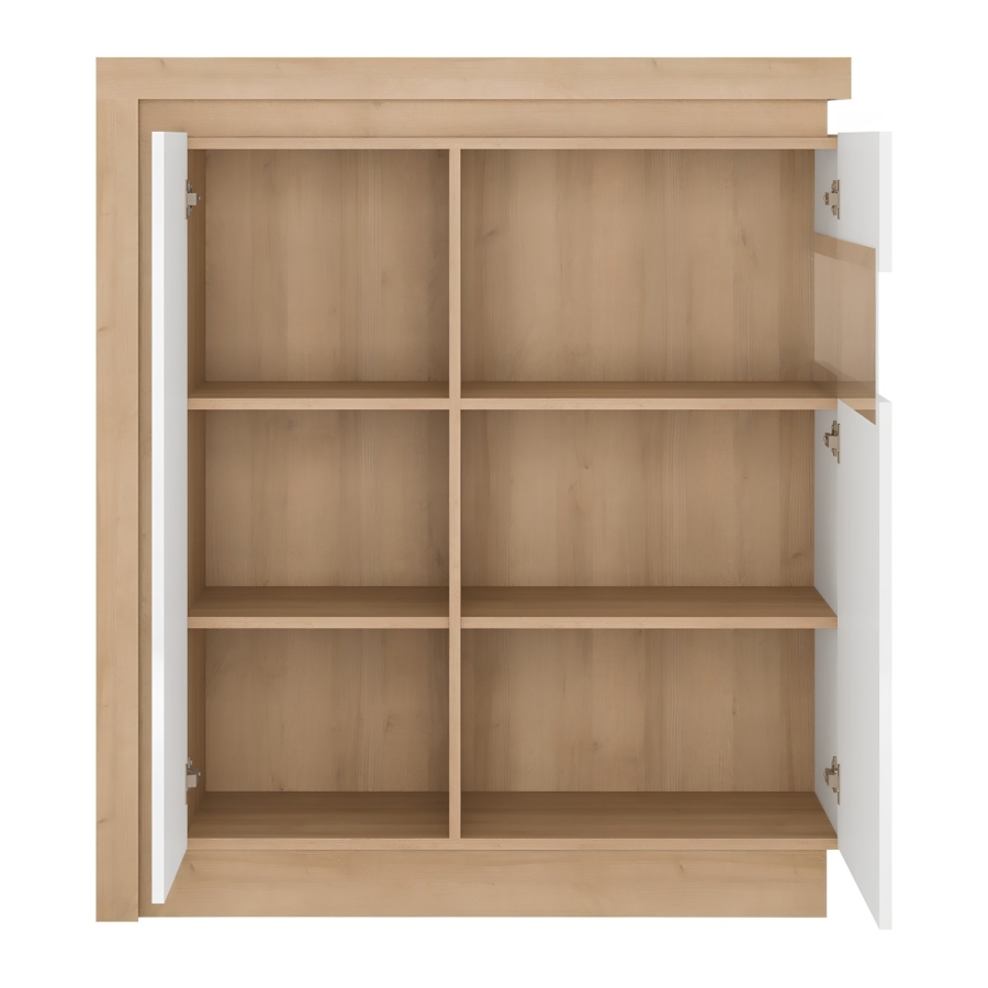 Komód LYOV04P a LEONARDO elemes bútorból riviera tölgy/fehér magasfényű változatban. Méretek (SzéxMéxMa): 107x42x124 cm Csendes ajtócsukódási rendszer Szállítás szétszerelve