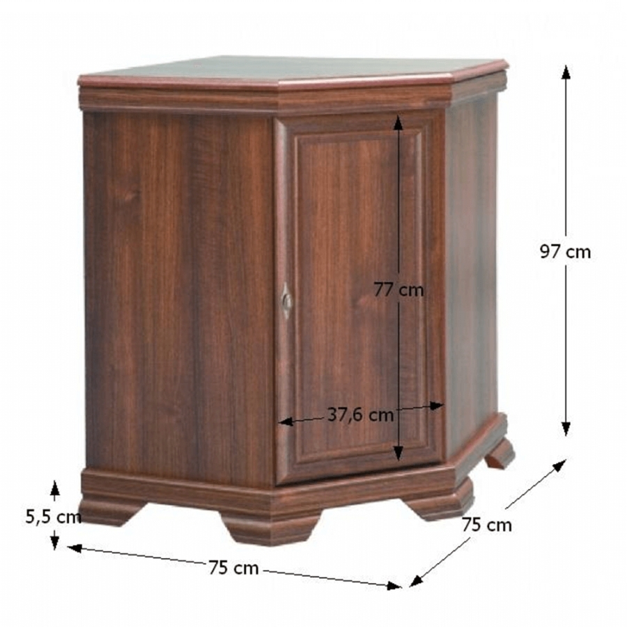 Sarokkomód - ideális az ebédlő, étkező, háló vagy dolgozószoba berendezéséhez. A KORA rusztikus bútorcsaládból, könnyen kombinálható elképzelése szerint. Egy ajtóval és nagy tárolóhellyel rendelkezik. Anyaga:laminált DTD Színváltozat: samoa king Méretek (SzéxMaxMé): 75x97x75 cm Az alsó tér magassága a padlótól: 10,5 cm Lapraszerelten szállítva