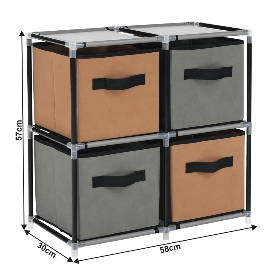 Szerkezet anyaga: fém Szín: fekete Anyag fiókok: szövet Szín: barna/szürke Kötőelemek anyaga: műanyag Méretek (SzxMéxMa): 58x30x57 cm Négy fiók Praktikus Fém szerkezet Szövet fiókok Fogantyúkkal Műanyag kötőelemek Egyszerű összeszerelés Többféle módon összerakható Szétszerelve szállítjuk