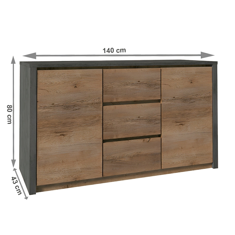Komód, MONTANA K2DP Anyag: laminált DTD/ABS élek Szín: tölgy lefkas sötét/smooth szürke Méretek (SzéxMéxMa): 140x43x80 cm Szállítás szétszerelve.