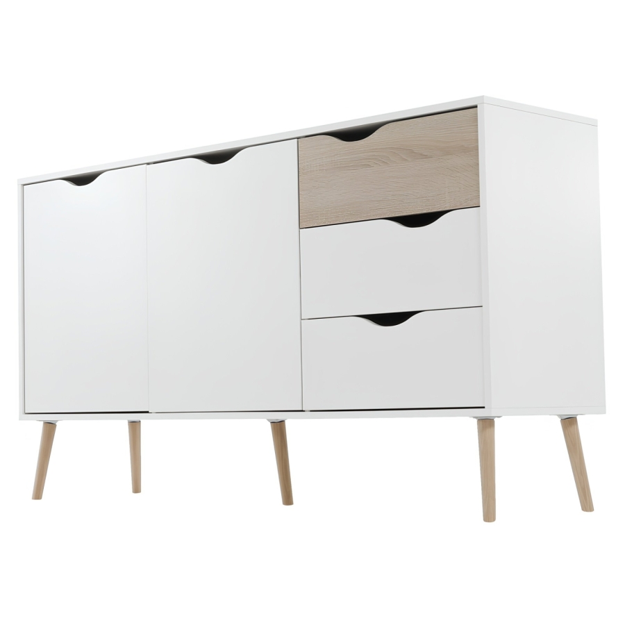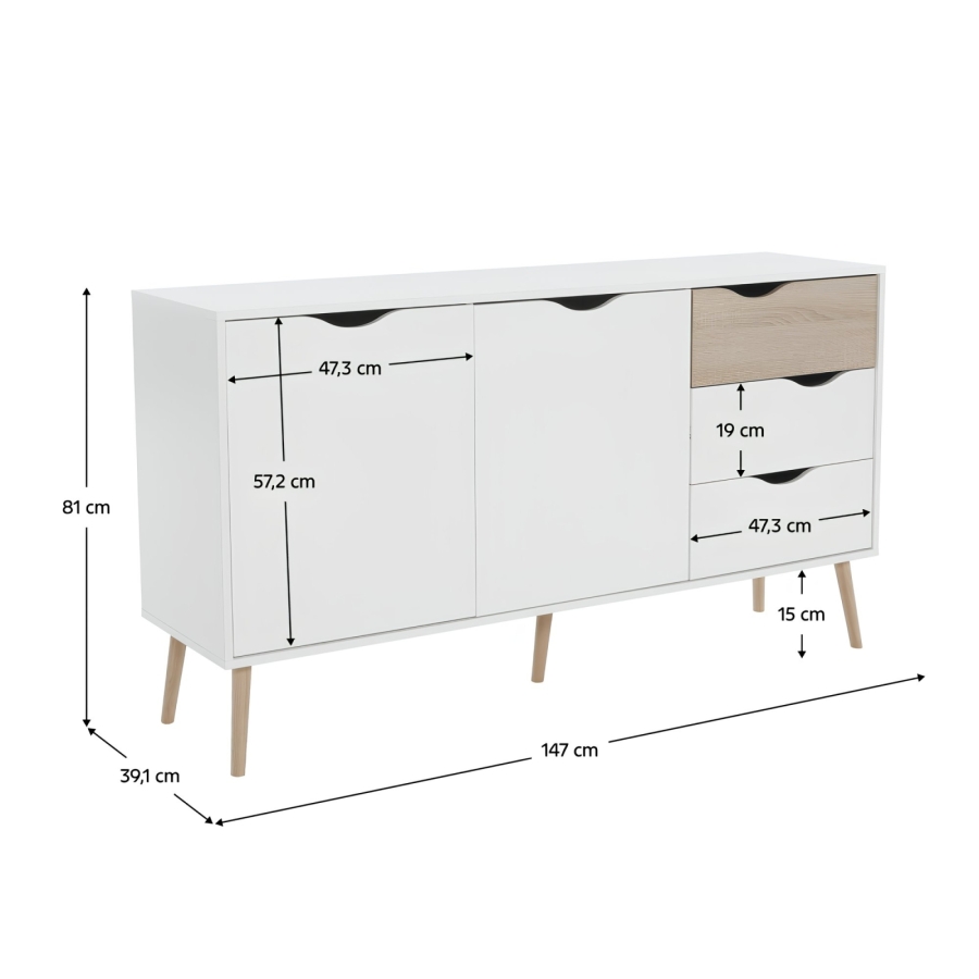 OSLO komód 75381 Anyag: laminált DTD Változat: sonoma tölgy/fehér Méretek (SzéxMéxMa): 147,1x39,1x81 cm Két ajtó 4 polc 3 fiók Anyag vastagsága: 1,6 cm Lábak magassága: 15 cm Szállítás szétszerelve