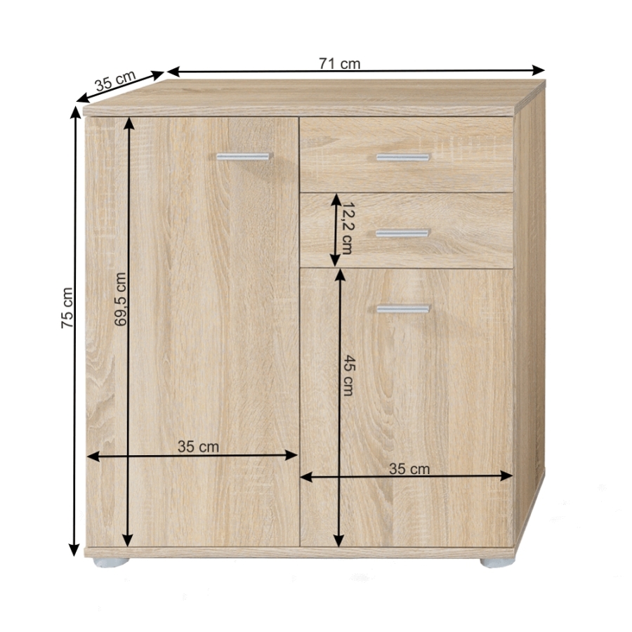 Komód 2-2T2S két szekrénnyel és két fiókkal Anyag: laminált DTD Szín: sonoma tölgy Méretek (SzéxMéxMa): 71x35x75 cm Szállítás szétszerelve