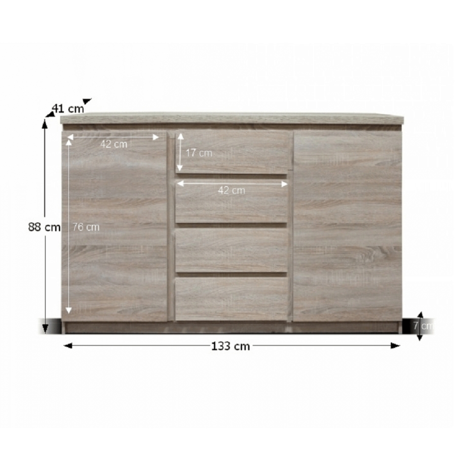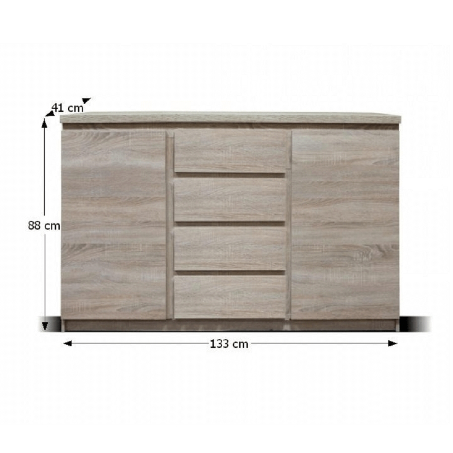 Kétajtós komód, négy fiókos, TYP 08. Anyag: laminált DTD, ABS élek. Szín: tölgyfa sonoma. Méretek SzéxMéxMa: 133x41x88 cm. Szállítas kiszerelésben.