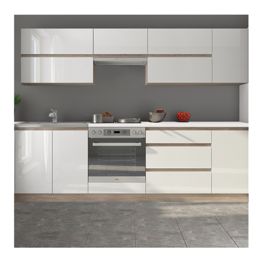 Alapkonyha: a váz DTD laminált sonoma tölgyfa, ajtók - , vagy a váz fehér magasfényű HG DTD laminált fehér/ajtók sonoma tölgyfa. Felső méret a füstelszívó szekrénykével: 2,6 m, alsó méret: 2,6 m,