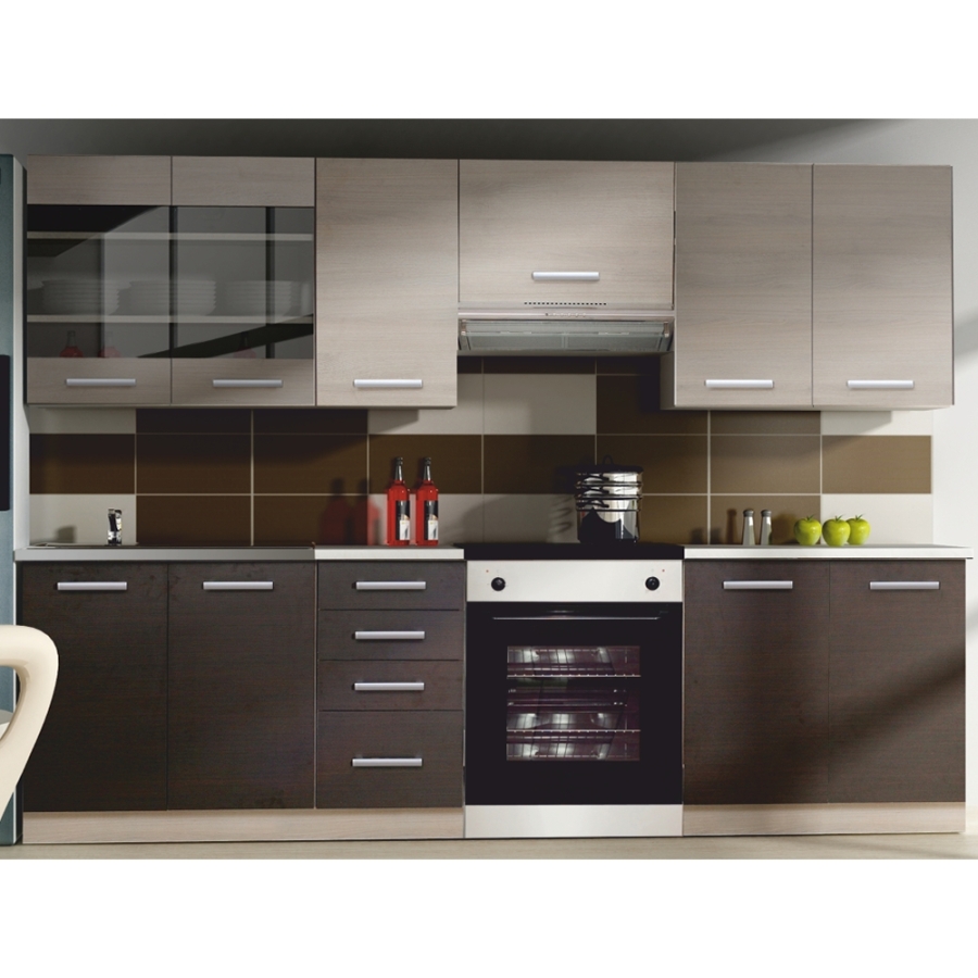 A konyha elemei: felső és alsó szekrények ajtóval, felső üvegszekrény és négy fiók
