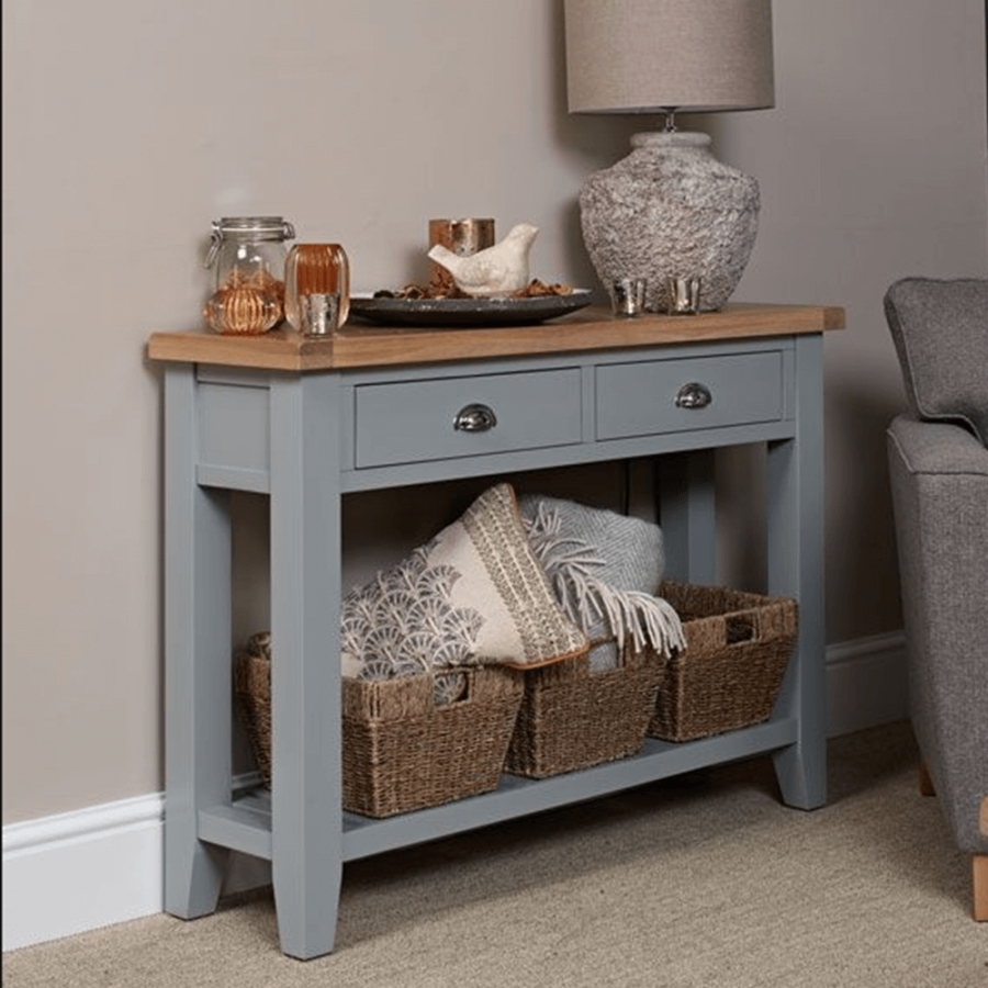 Anyag: MDF/laminált DTD Anyagvastagság: 25 mm Szín: szürke/világos dió Méretek (SzxMéxMa): 80x30x80 cm Két fiók Polccal Konzolasztal Szétszerelve szállítjuk.