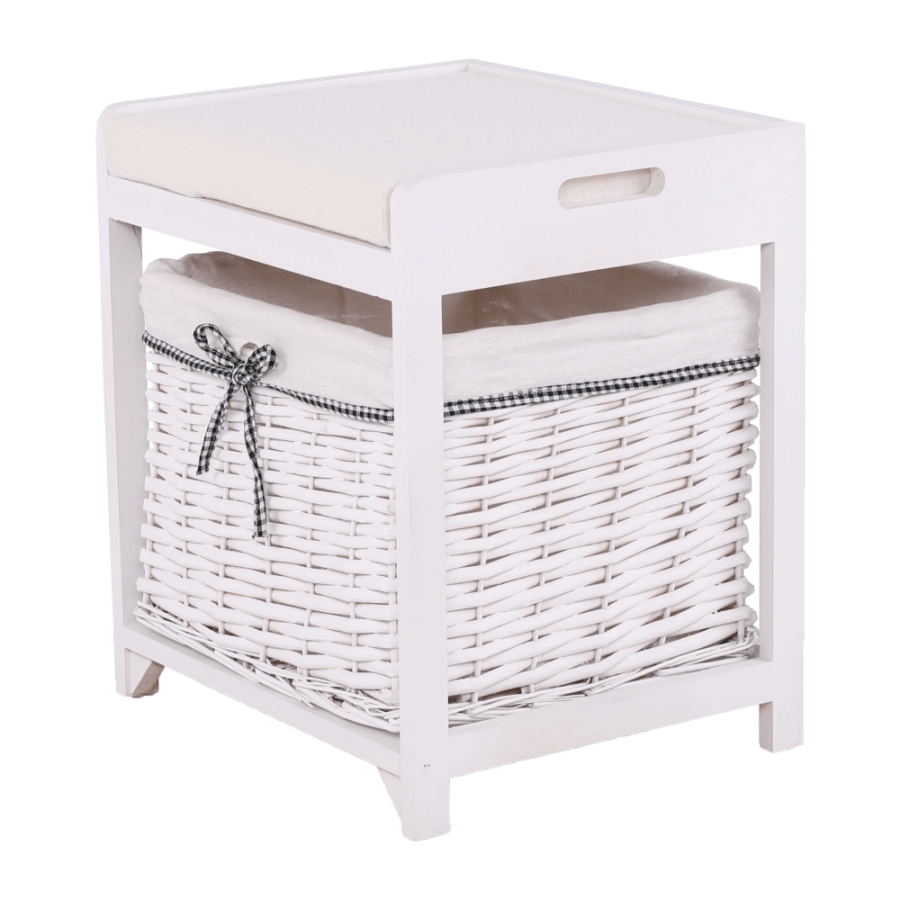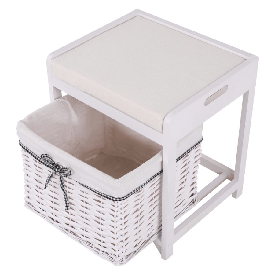 Praktikus lóca fonott kosárral és párnával Anyag: fa / vesszőfonás, Színváltozat: régifehér Méretek (SzéxMaxMé): 40x45x34 cm.