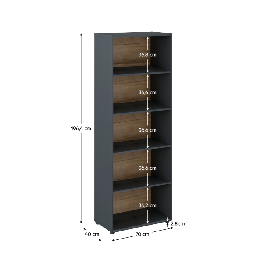 Anyag: laminált DTD Szín: grafit/artisan tölgy Méretek (SzxMéxMa): 70x40x196,40 cm Anyag vastagsága: 1,6-2,2 cm Nyitott tárhely Négy polc Polc teherbírása: 5 kg Lábakon Állítható magasságú lábak Lábak anyaga: fém Lábak színe: grafit Lábak magassága: 2,8-4,3 cm Minőségi szlovák termék Szétszerelve szállítva