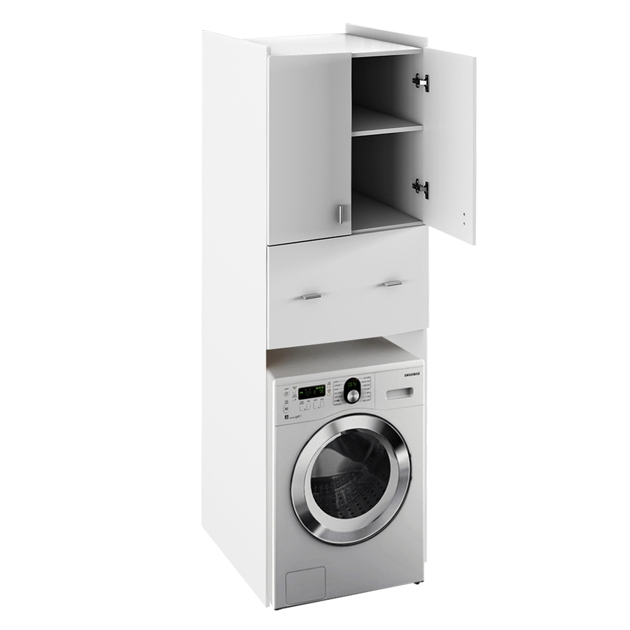 Szekrény mosógép fölé, NATALI 9 Anyag: laminált DTD Szín: fehér Méretek (SzéxMéxMa): 64x60x190 cm Hely a mosógép számára (SzéxMa): 60,8x85,2 cm Minőségi szlovák termék Lapraszerelten szállítva
