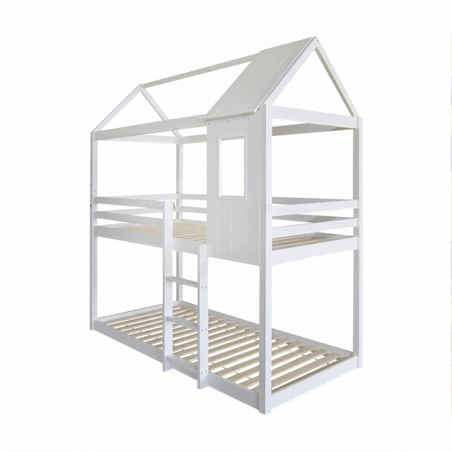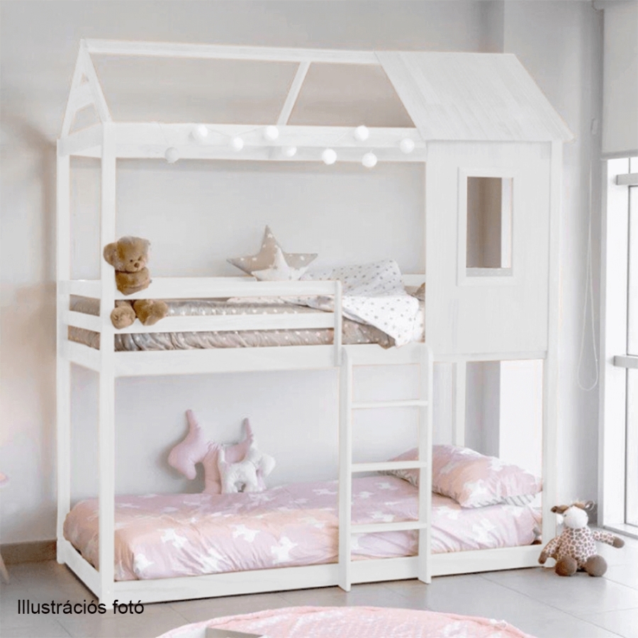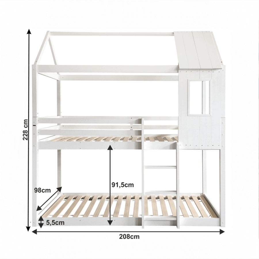 Anyag: masszív fenyőfa/furnérlemez Szín: fehér Méretek (SzéxMéxMa): 208x98x228 cm Fekvőterület (SzéxMé): 90x200 cm Alsó ágy magassága az ágyrácsig: 5,5 cm Felső ágy magassága az ágyrácsig: 91,5 cm Matrac maximális magassága a felső ágyon: 14 cm Létrával Biztonságos korláttal Szállítás összetekerhető ágyrácsokkal Szállítás matrac nélkül Hozzárendelhető matracok Ajánlott matrac típus: rugós Szállítás szétszerelve