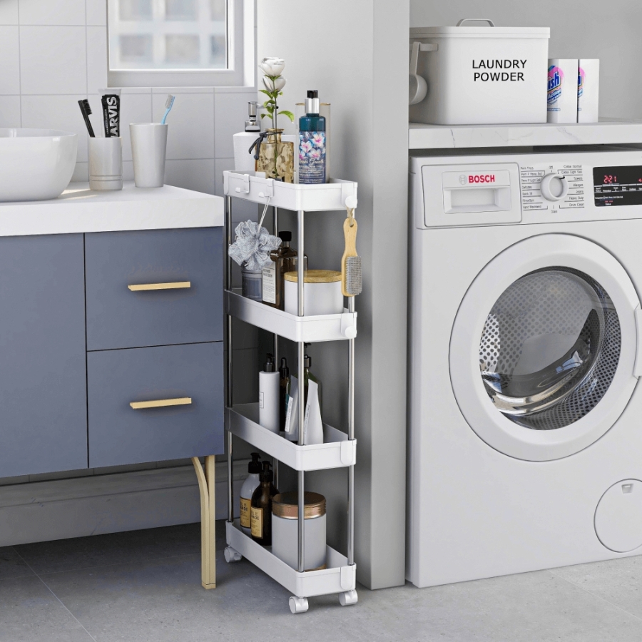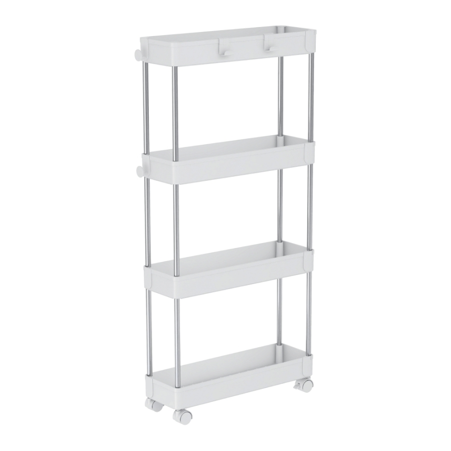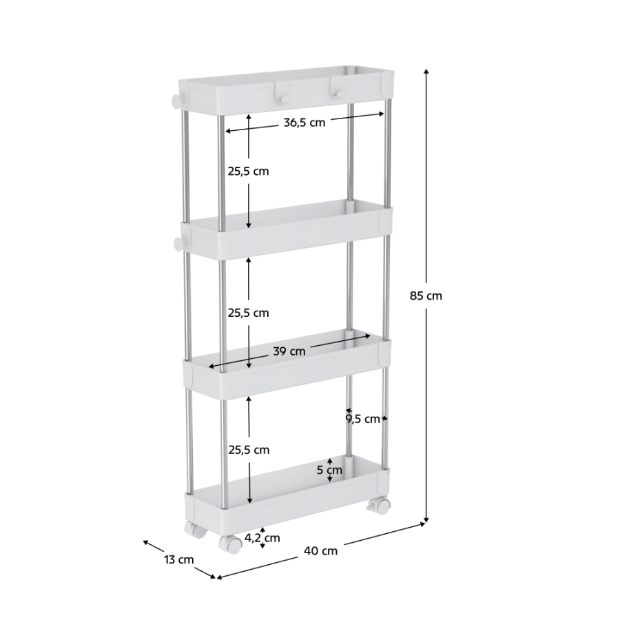 Anyag: műanyag/rozsdamentes acél Szín: fehér Méretek (SzxMéxMa): 40x13x85 cm Négy műanyag polc Polc magassága: 5 cm Polcok közti magasság: 25,5 cm Polc teherbírása: 3 kg Biztosított légáramlás Kampókkal Mozgatható Kerekeken Forgó Kerekek magassága: 4,2 cm Négy kerék Két kerék fékkel Rozsdamentes acél szerkezet Modern dizájn Szétszerelve szállítva