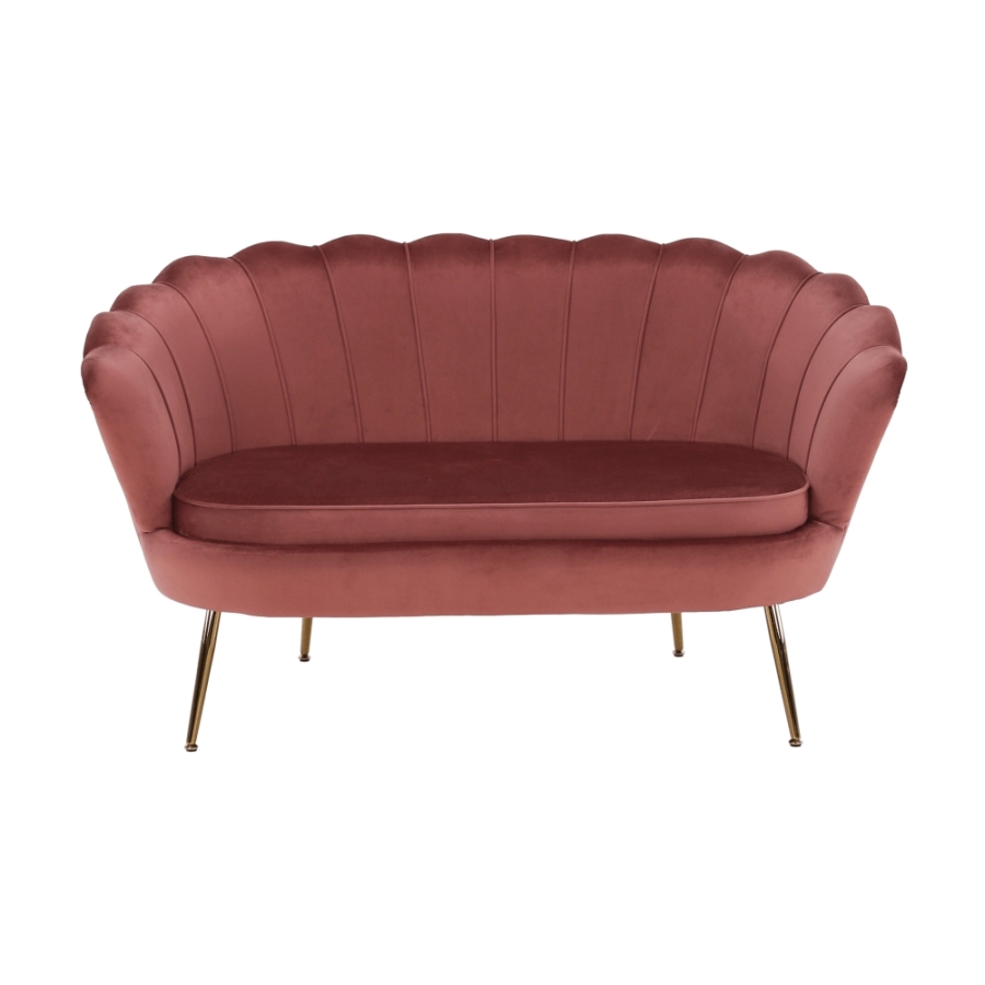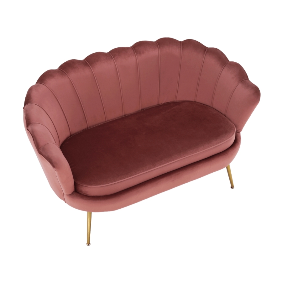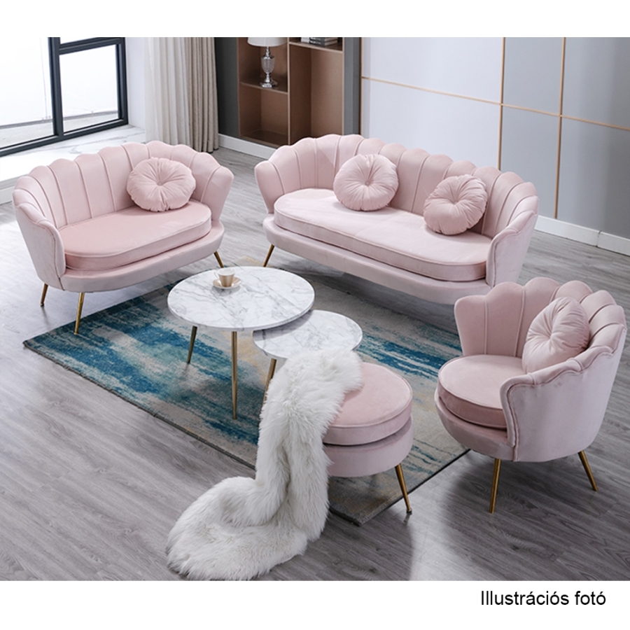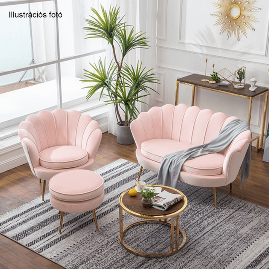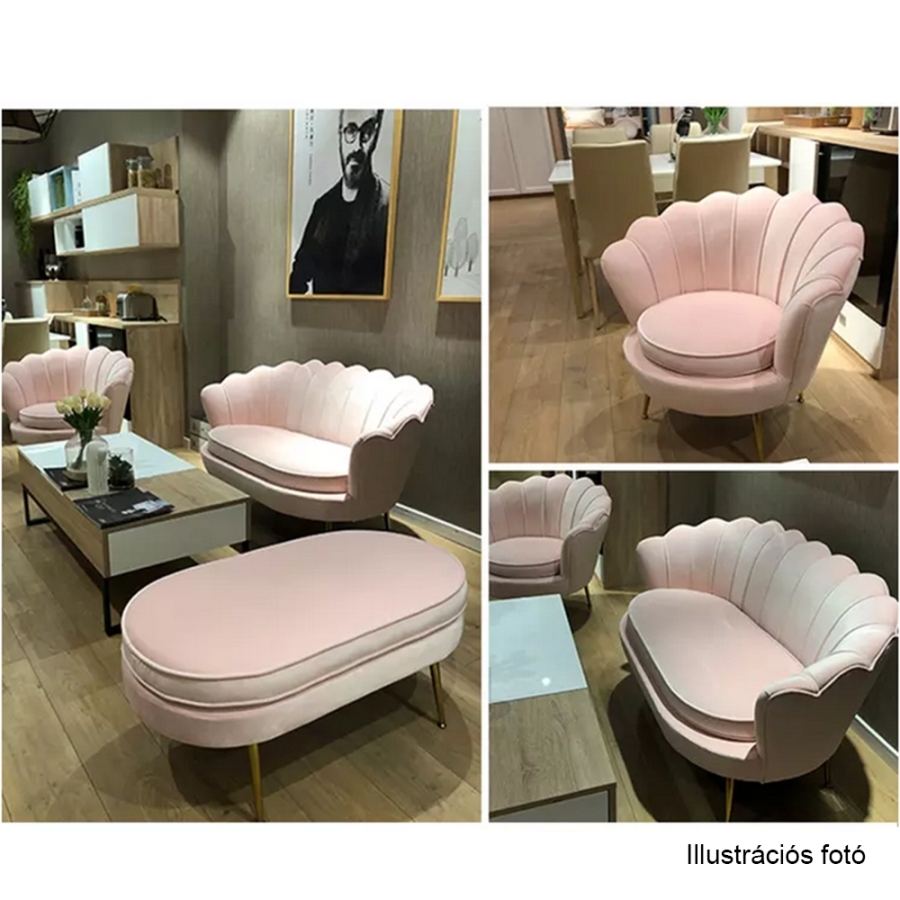 Ülőlap anyaga: Velvet szövet A szövet kopásállósága: 80 000 Martindale Szín: rózsaszín 23 Lábak anyaga: fém Szín: gold króm-arany Méretei (SzéxMéxMa): 132x76x77 cm Ülés mélysége: 56 cm Ülés magassága: 44 cm Terhelhetőség: 180 kg Dizájnos Art-deco stílus Kagyló alak Modern kidolgozás Bontásban szállítva.