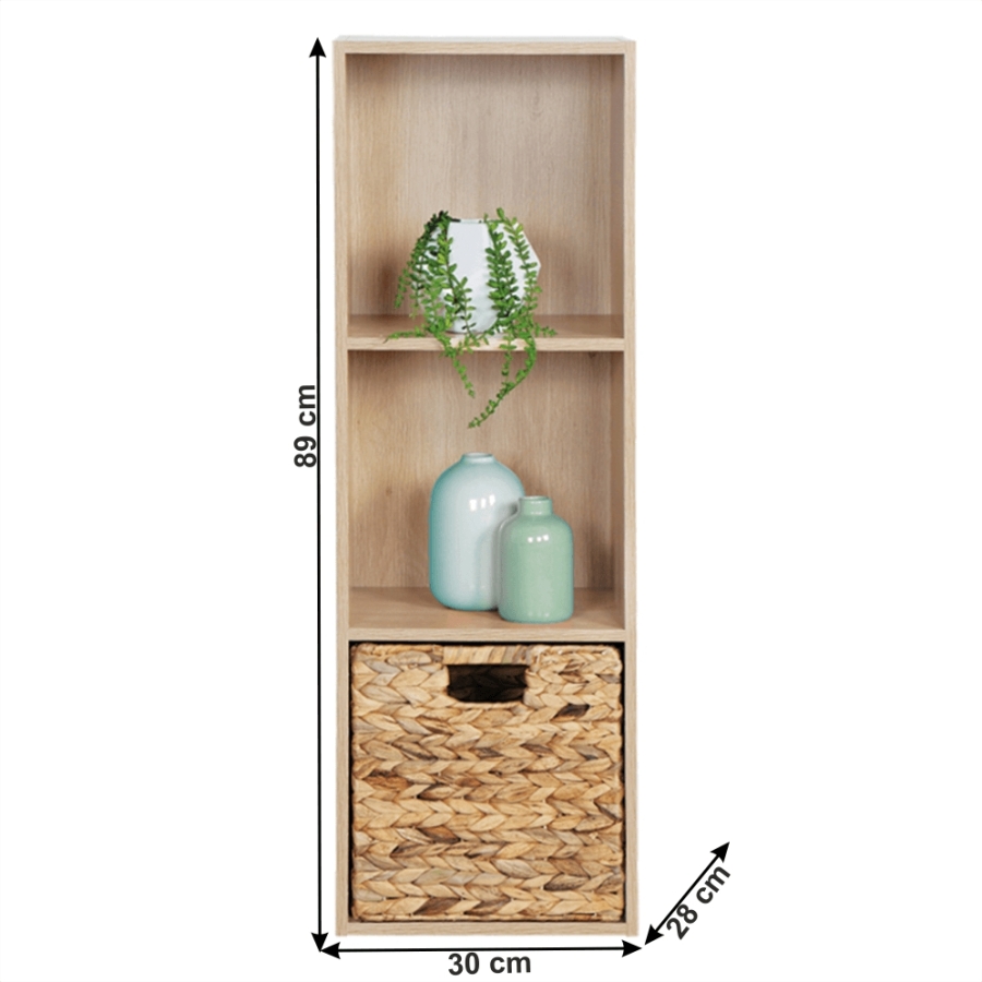Anyag: MDF fóliázott Szín: természetes tölgy Méretei (SzéxMéxMa):30x28x89 cm Három polc Nytott tárolóhely A termékhez nem tartozik tároló doboz Javasoljuk, hogy rögzítse a falhoz A falhoz való rögzítéshez szükséges anyagokat a csomagban találja. Bontásban szállítva.