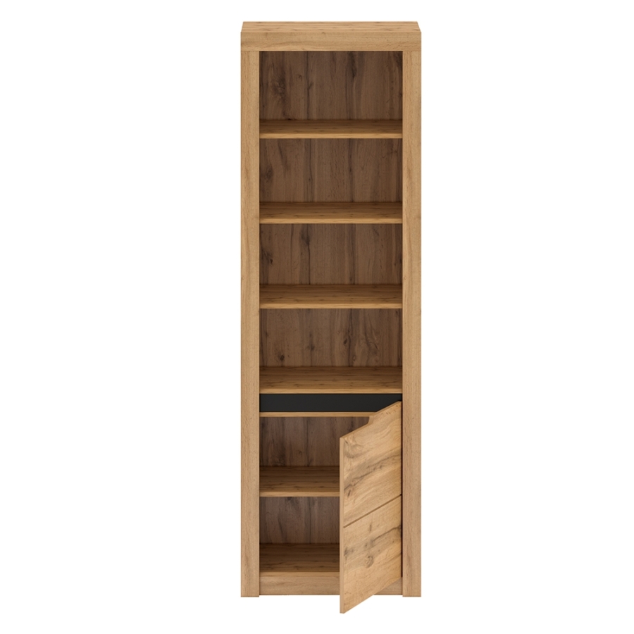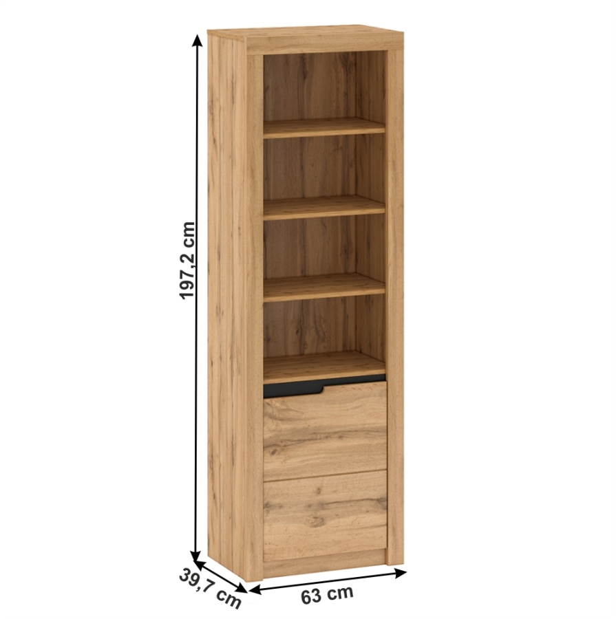 Anyag: DTD laminált/MDF Szín: wotan tölgy Méretei (SzéxMéxMa): 63x39,7x197,2 cm Korpusz anyag vastagsága: 16 mm Ajtó anyaga vastagsága: 19 mm Egy szekrény Nyitott tárhely Polcokkal Jobbos Bontásban szállítva.