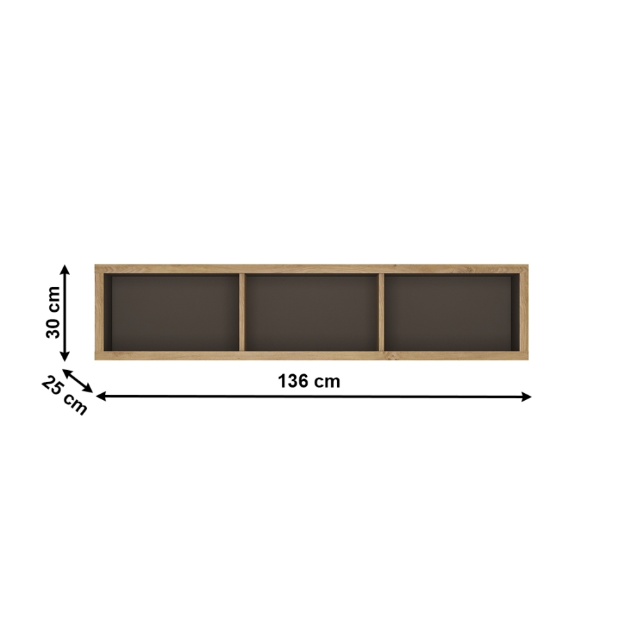 Anyag: laminált DTD Színkivitel: shetland tölgy/szürke Méretek (SzxMéxMa): 136x25x30 cm Korpusz vastagsága: 2,8 cm Egyszerű a elegáns Vastag korpusz 3 nyitott rész fali modern stílus Kiváló minőség Precíz kidolgozás Polc teherbírása: 5 kg Bontásban szállítva