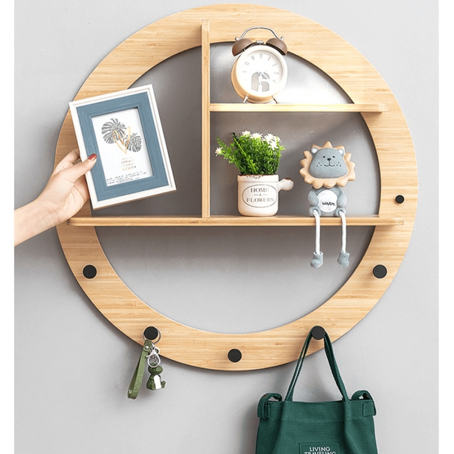 Anyag: lakkozott bambusz Szín: természetes Méretek (SzxMxMa): 46x10x41 cm Öt kampóo Három polc Kerek forma Teherbírás: 10 kg