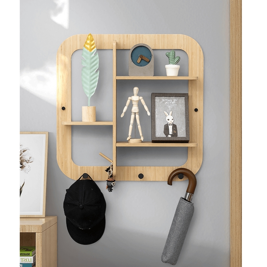 Anyag: lakkozott bambusz Szín: természetes Méretek (SzxMxMa): 52x10x59,5 cm Négyszögletes forma Négy kampó Három polc Teherbírás: 10 kg