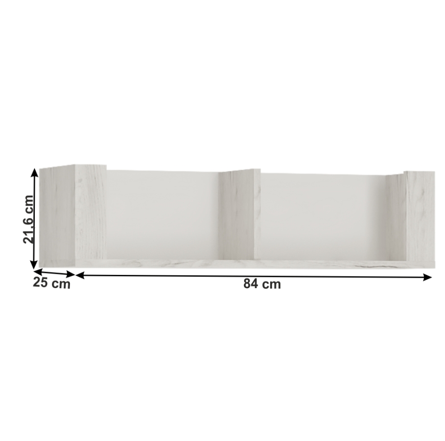 Polc typ 62 az ANGEL elemes bútor kínálatunkból, mely alkalmas a gyerek vagy diákszobákba, Anyag: laminált DTD, Színváltozat: fehér craft. Méretek (SzéxMéxMa): 84x25x21,6 cm, Szétszerelt állapotban szállítjuk