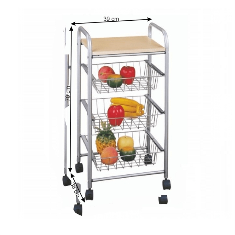 Méretek (SzxMéxMa): 39x36x70 cm Anyag vastagsága: 15 mm Anyag: MDF bükk/ fém Mozgatható polcállvány 3 drótkosár Fa polc 4 forgó kerék Bontásban szállítva