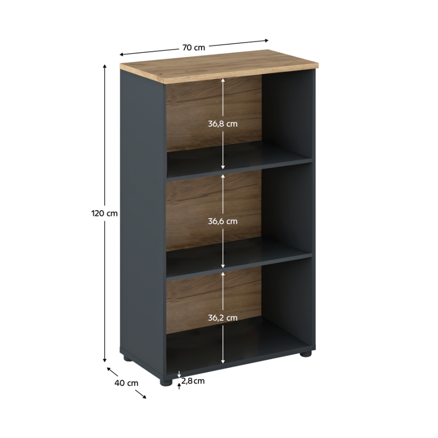 Anyag: laminált DTD Szín: grafit/artisan tölgy Méretek (SzxMéxMa): 70x40x120 cm Anyag vastagsága: 1,6-2,2 cm Nyitott tárhely Két polc Polc teherbírása: 5 kg Lábakon Állítható magasságú lábak Lábak anyaga: fém Lábak színe: grafit Lábak magassága: 2,8-4,3 cm Minőségi szlovák termék Szétszerelve szállítva
