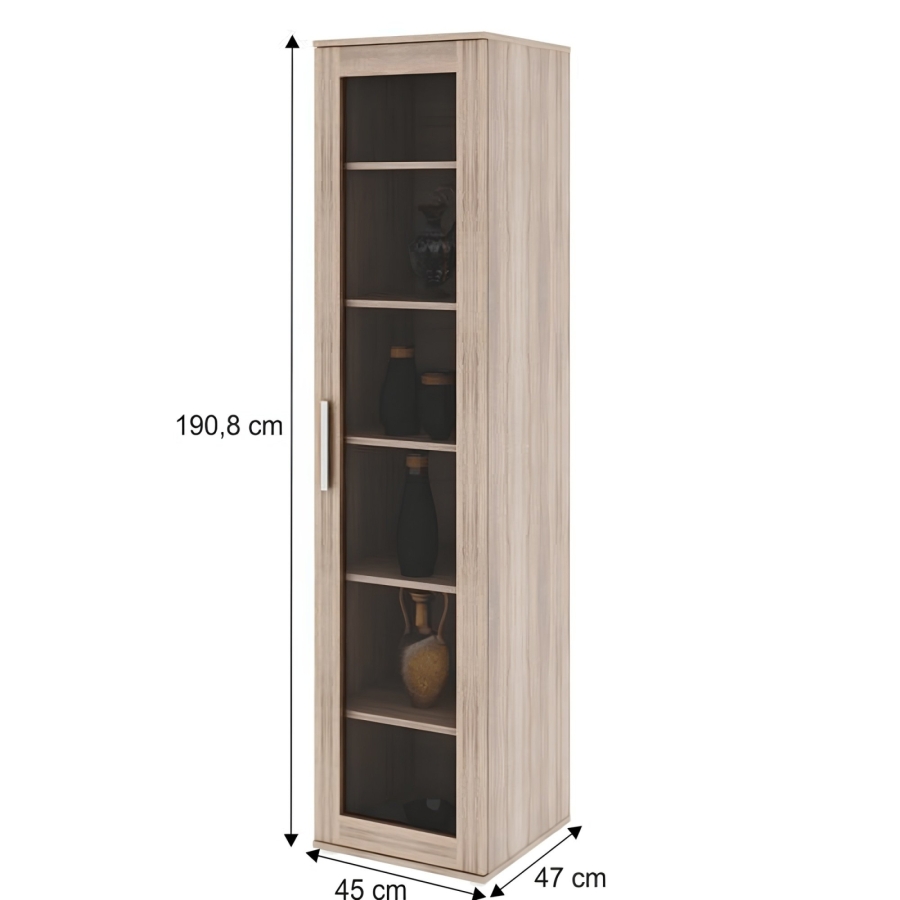 Anyaga: laminált DTD Színe: sonoma tölgyfa Méretek (SzéxMéxMa): 45x47x190,8 cm A bútorlap vastagsága: 1,6 cm A polcok teherbírása: 5 kg Tárolóhellyel Polcos 5 db polc Fém fogantyúkkal Üveg ajtóval Átlátszó üveg Minőségi szlovák termék Lapraszerelten szállítva