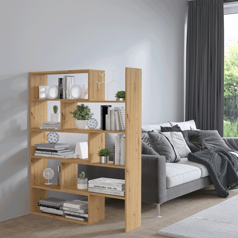 Modern többfunkciós polcrendszer KLOE II Anyag: laminált DTD Kivitelezés: artisan tölgy Méretek (SzéxMéxMa): 73-125x24x138 cm Bontásban szállítva.