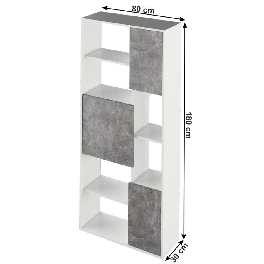 Többfunkciós polcállvány ULIMI Anyag: laminált DTD Szín: fehér/beton Méretek (SzxVxH): 80x30x180 cm Bontásban szállítva