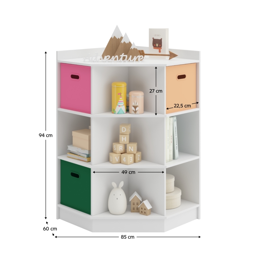 Anyag: melamin Színváltozat: fehér Méretek (SzxMéxMa):85x60x94 cm 9 tárolórekesszel 3 tárolódobozzal Nem szőtt anyagból készült dobozok Teherbírás: 60 kg Szétszerelve szállítva