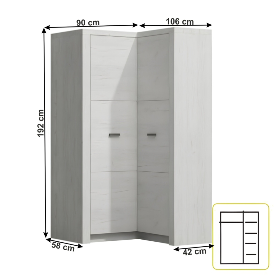 Sarokszekrény INFINITY 14 Váz vastagsága: 48 mm, fém fogantyúk Anyag: laminált DTD, ABS élek Színváltozat: fehér kőris Méretek (SzéxMéxMa): 90/106x58/42x192 cm Szétszerelt állapotban szállítjuk