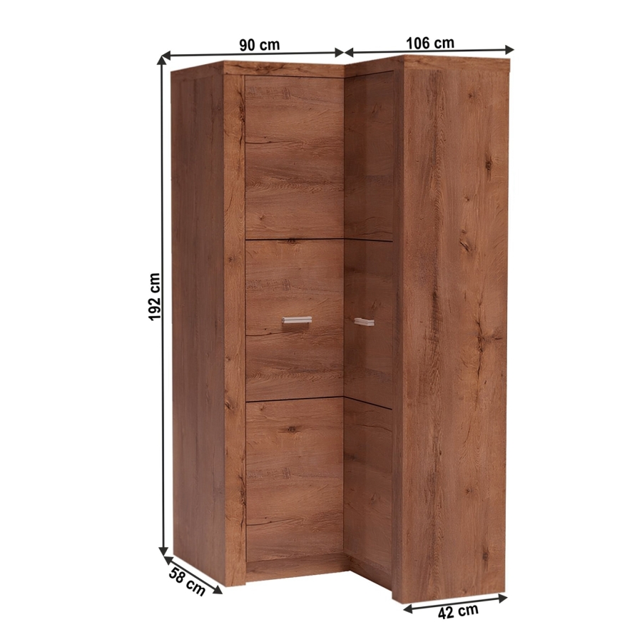 Sarokszekrény INFINITY 14 Váz vastagsága: 48 mm, fém fogantyúk Anyag: laminált DTD, ABS élek Színváltozat: világos kőris Méretek (SzéxMéxMa): 90/106x58/42x192 cm. Szétszerelt állapotban szállítjuk