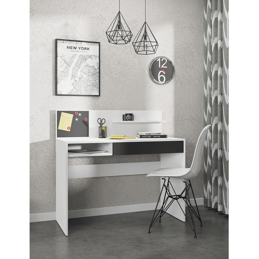 Anyag: laminált DTD Szín: fehér/fekete Méretek (SzéxMéxMa): 110x50x103 cm Fiókkal Mágneses táblával Polccal Nyitott rakodótér Bontásban szállítva.