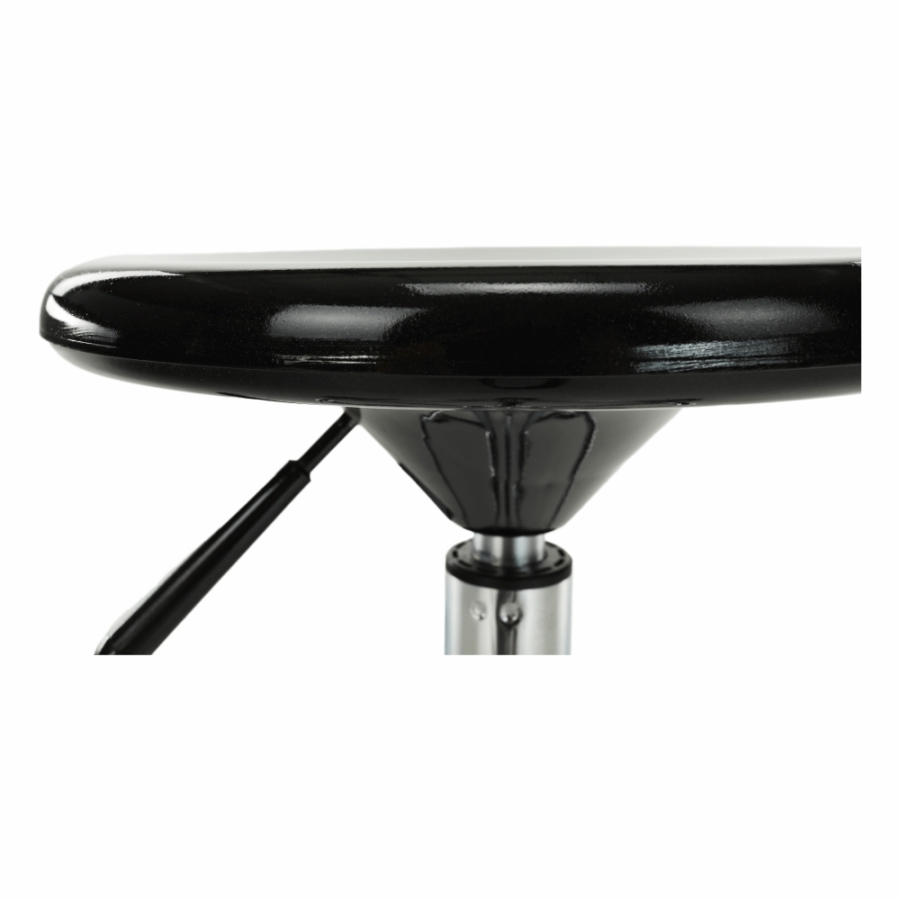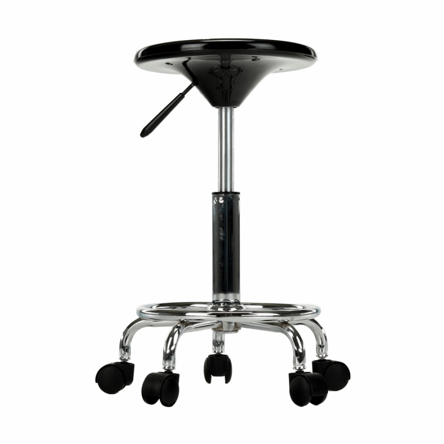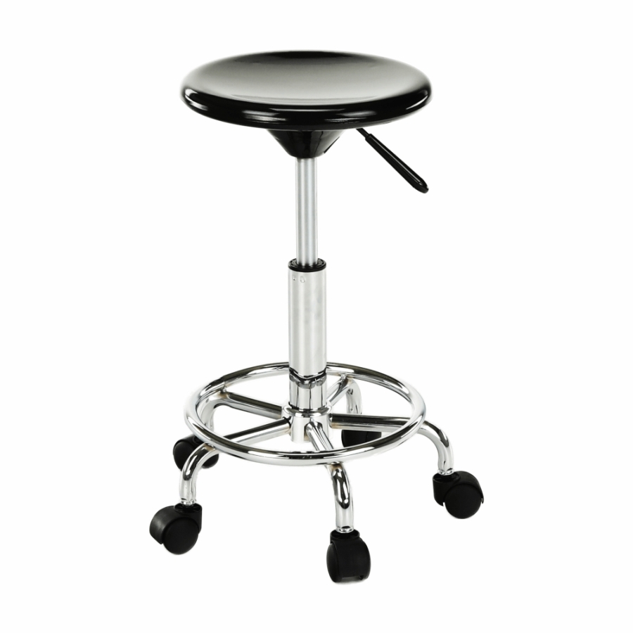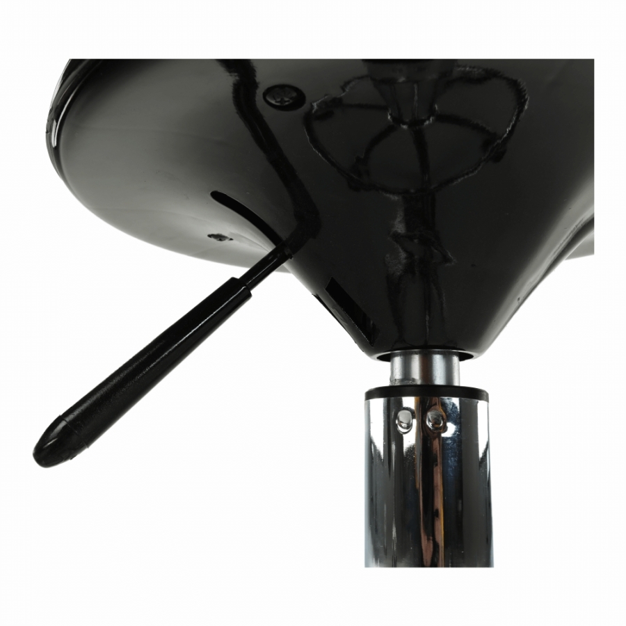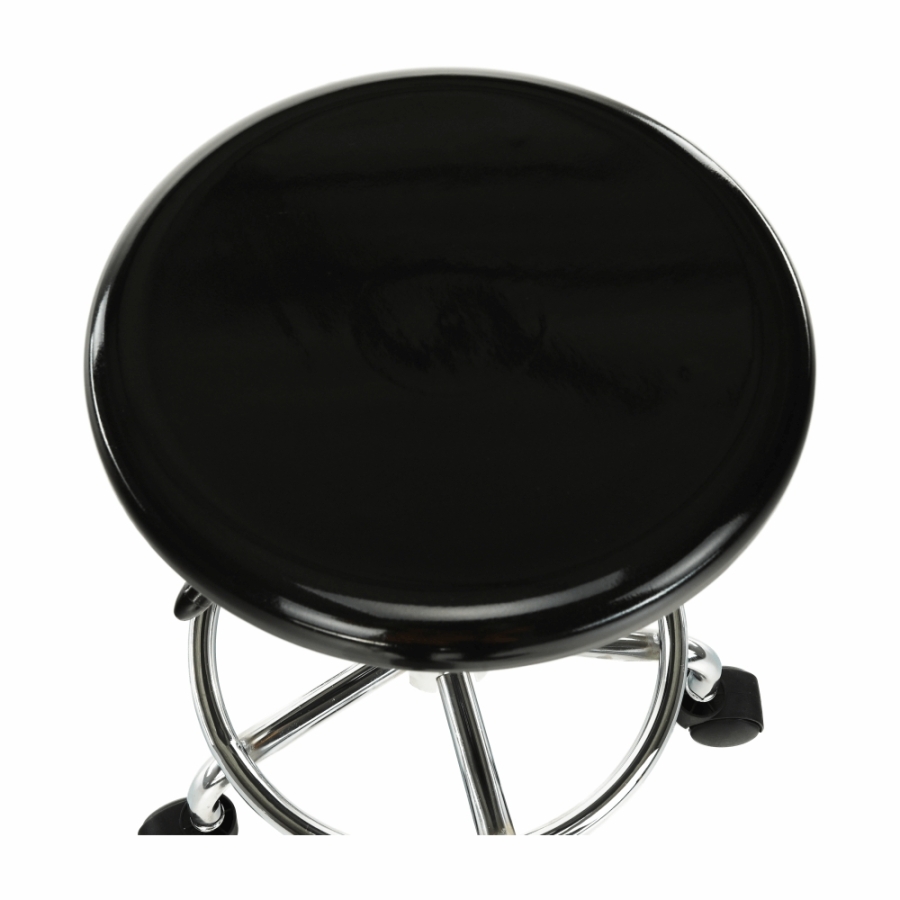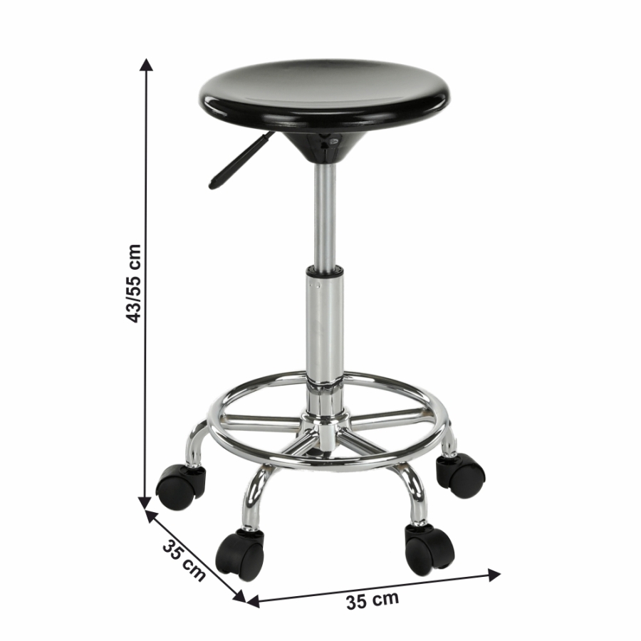 Szék - ülőke kerekeken, állítható magasságú MABEL 3 New Anyag: króm/ műanyag Szín:fekete Méretek(SzéxMéxMa): 35x35x43/55 cm Ülésmagasság : 43/55 cm Kapacitás 90 kg Bontásban szállítva