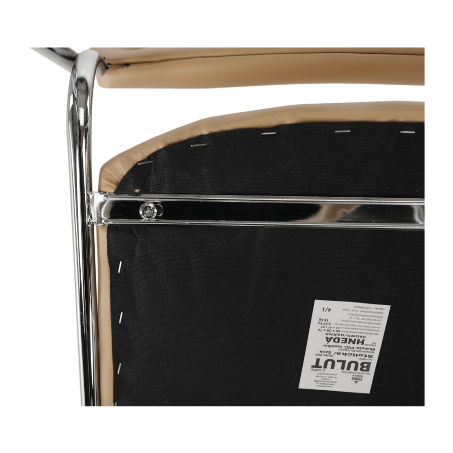 Szék tárgyalóterembe BULUT Szín: barna/króm Anyag: textilbőr/fém A szövet kopásállósága: 100 000 Martindale Méretek (SzéxMéxMa): 50x56x76 cm Ülésmagasság: 43 cm Ülésmélység: 41 cm Ülésszélesség: 40 cm Háttámla szélessége: 43 cm Háttámla magassága: 23 cm Rakásolható Szétszerelve szállítjuk