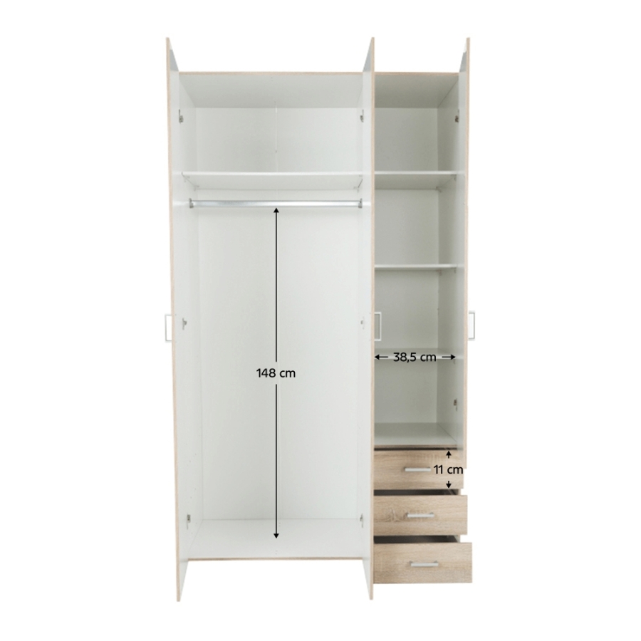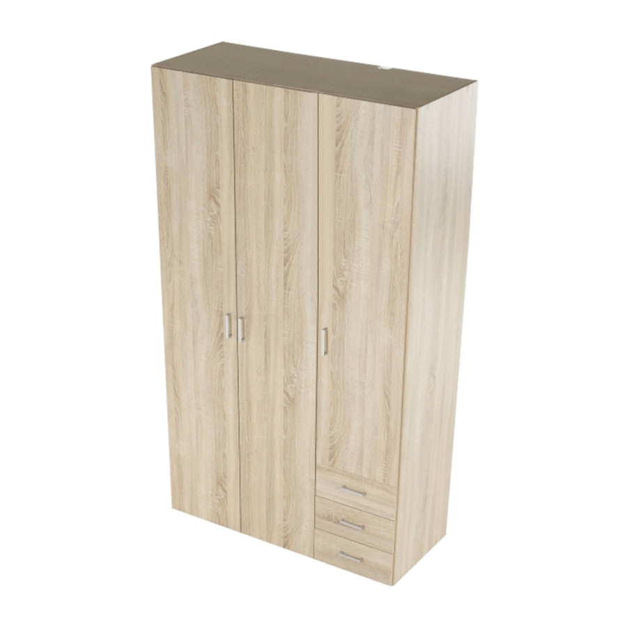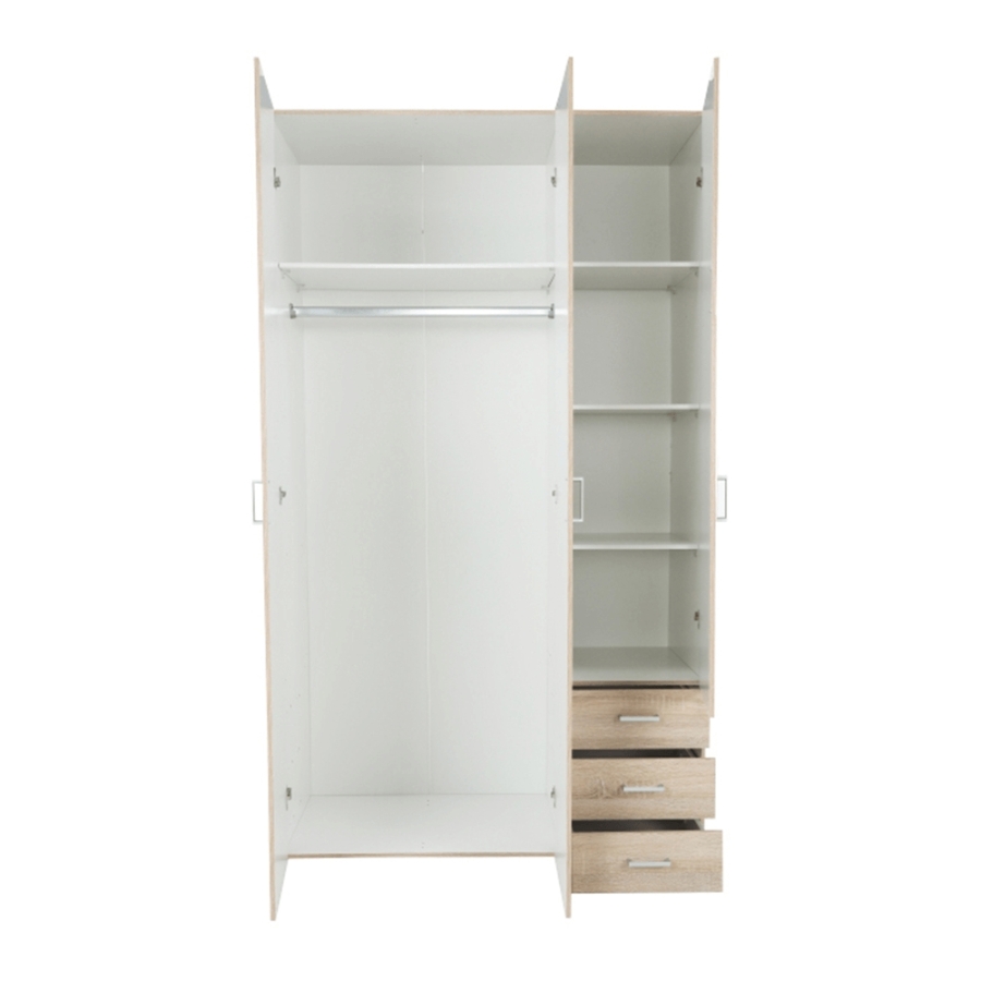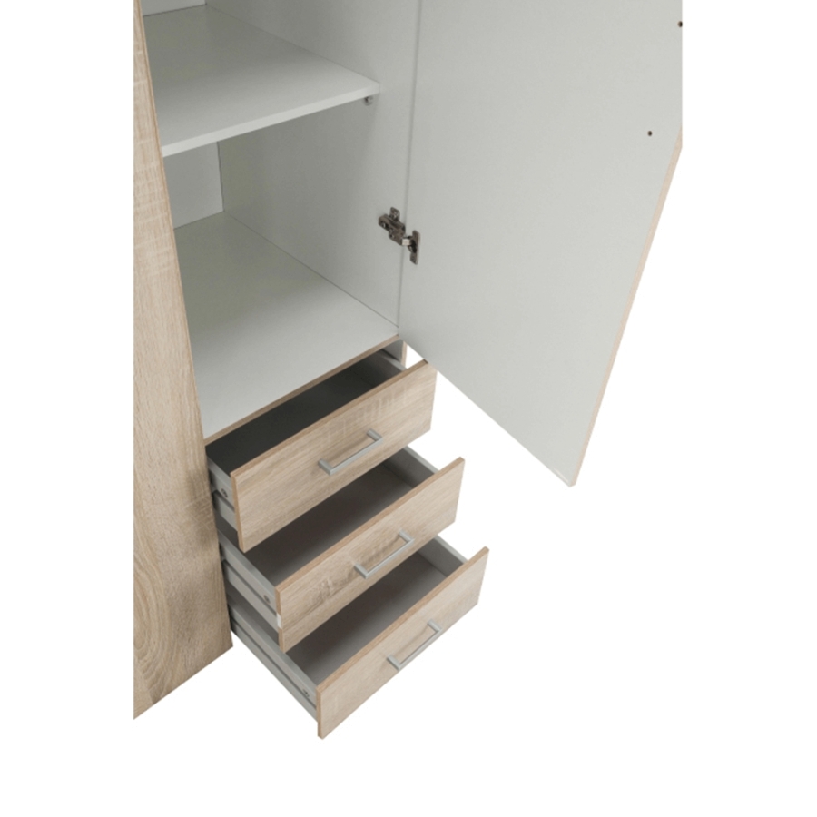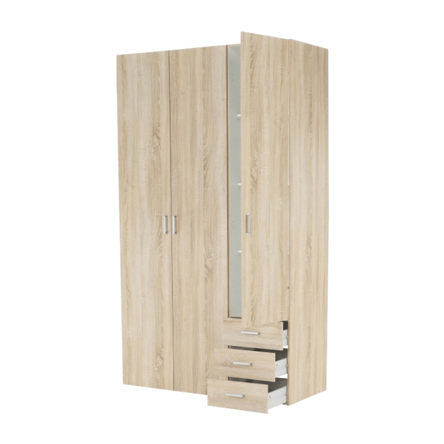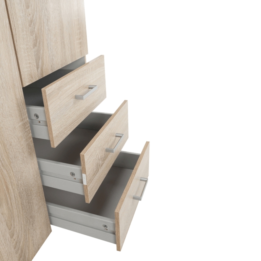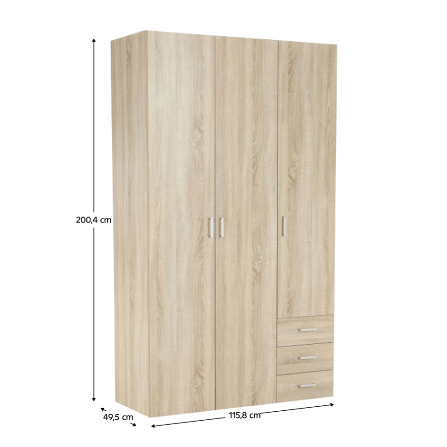 3 ajtós szekrény akasztórúddal és polccal, oldalsó szekrények polcosak, 3 fiók, GWEN 70429 Színe: sonoma tölgy Anyag: fóliázott DTD Méretek (SzéxMéxMa): 115,8x49,5x200,4 cm Anyag vastagsága: 12 mm Szállítás szétszerelve.