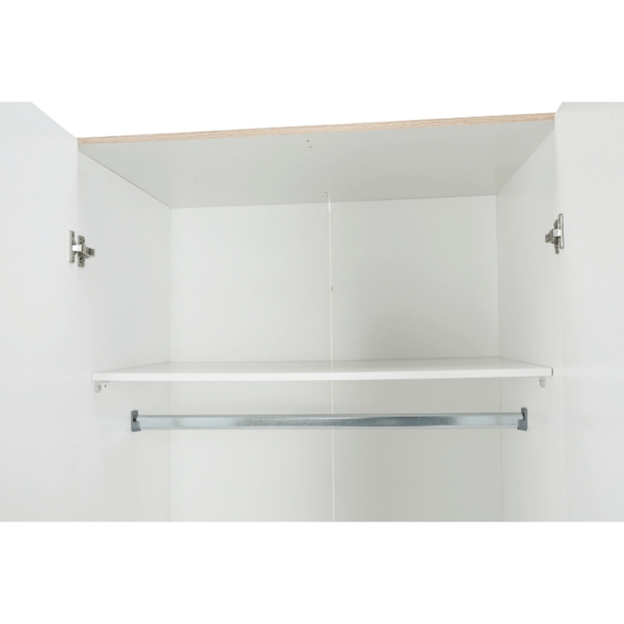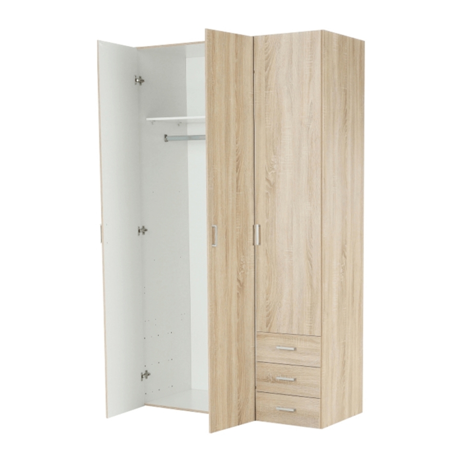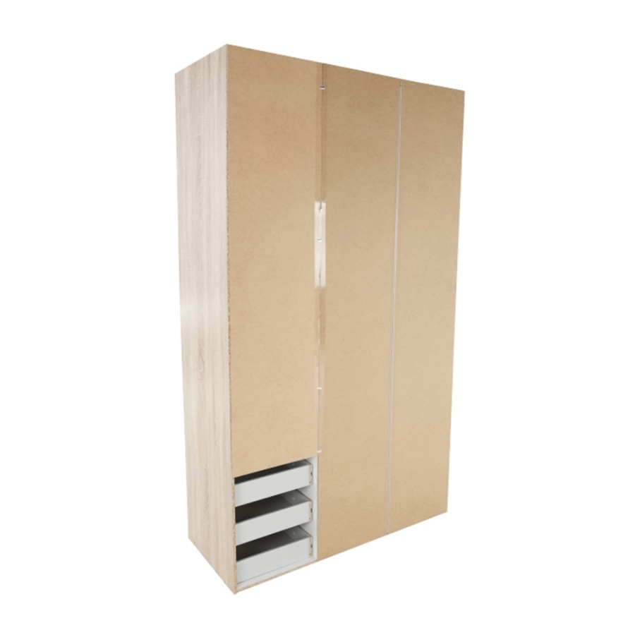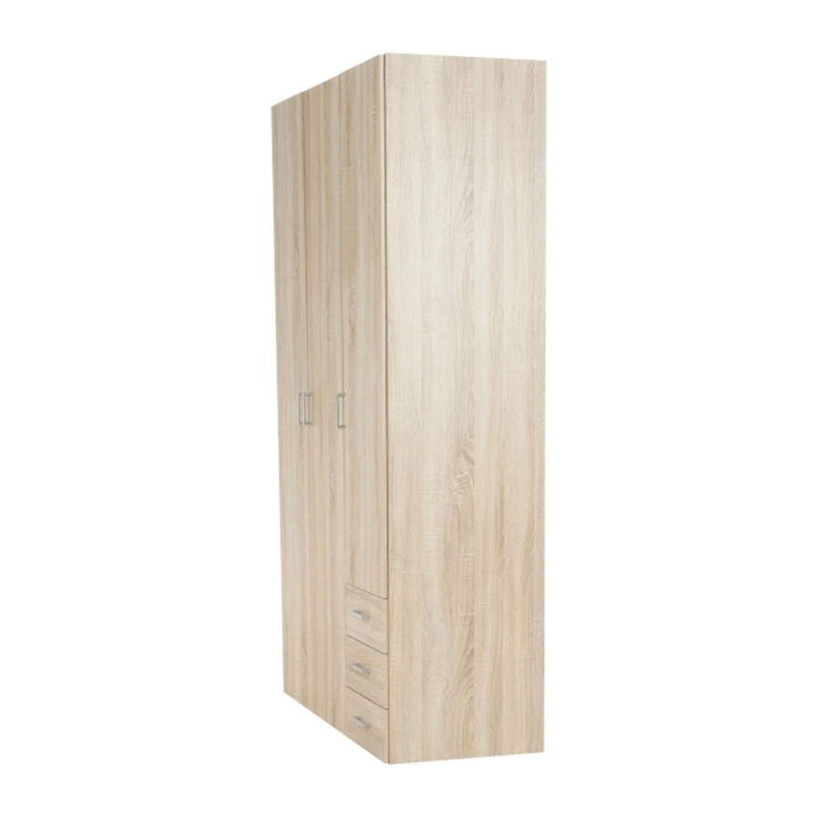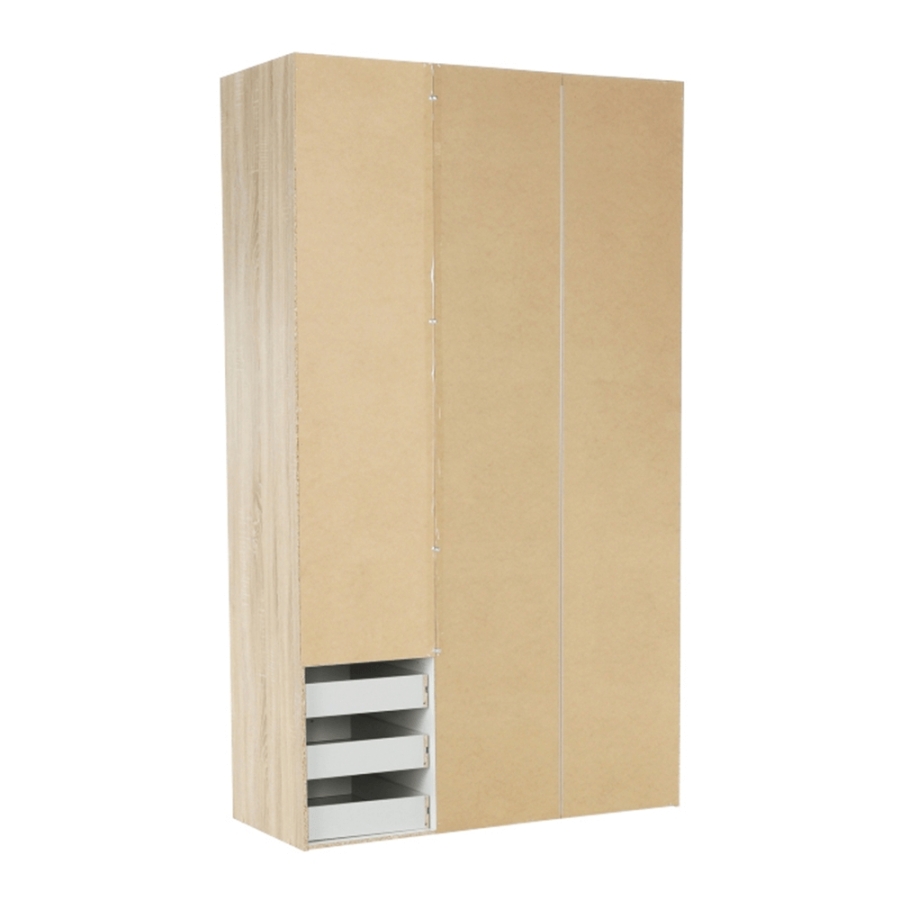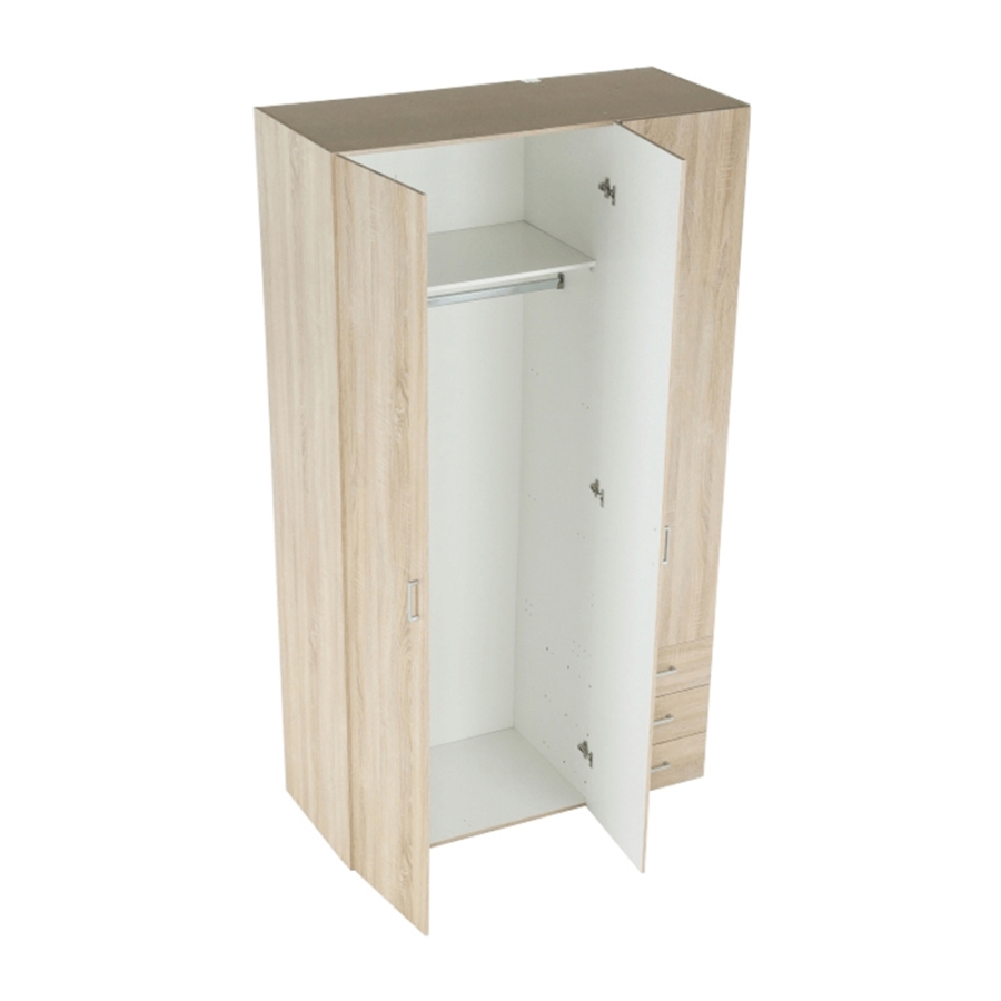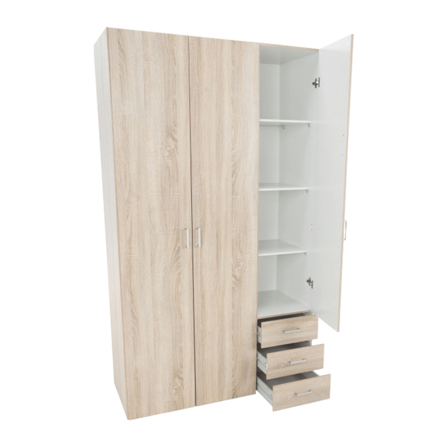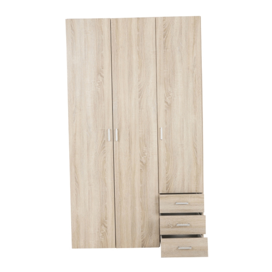3 ajtós szekrény akasztórúddal és polccal, oldalsó szekrények polcosak, 3 fiók, GWEN 70429 Színe: sonoma tölgy Anyag: fóliázott DTD Méretek (SzéxMéxMa): 115,8x49,5x200,4 cm Anyag vastagsága: 12 mm Szállítás szétszerelve.