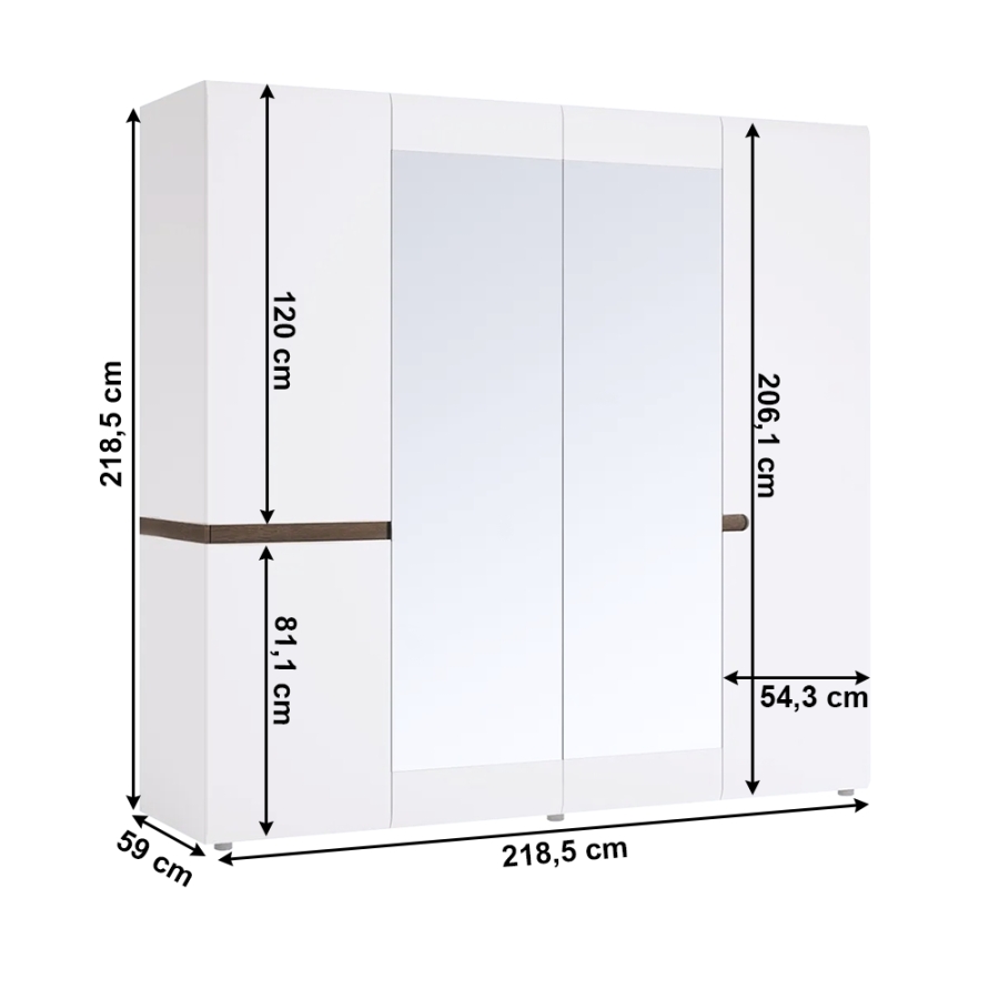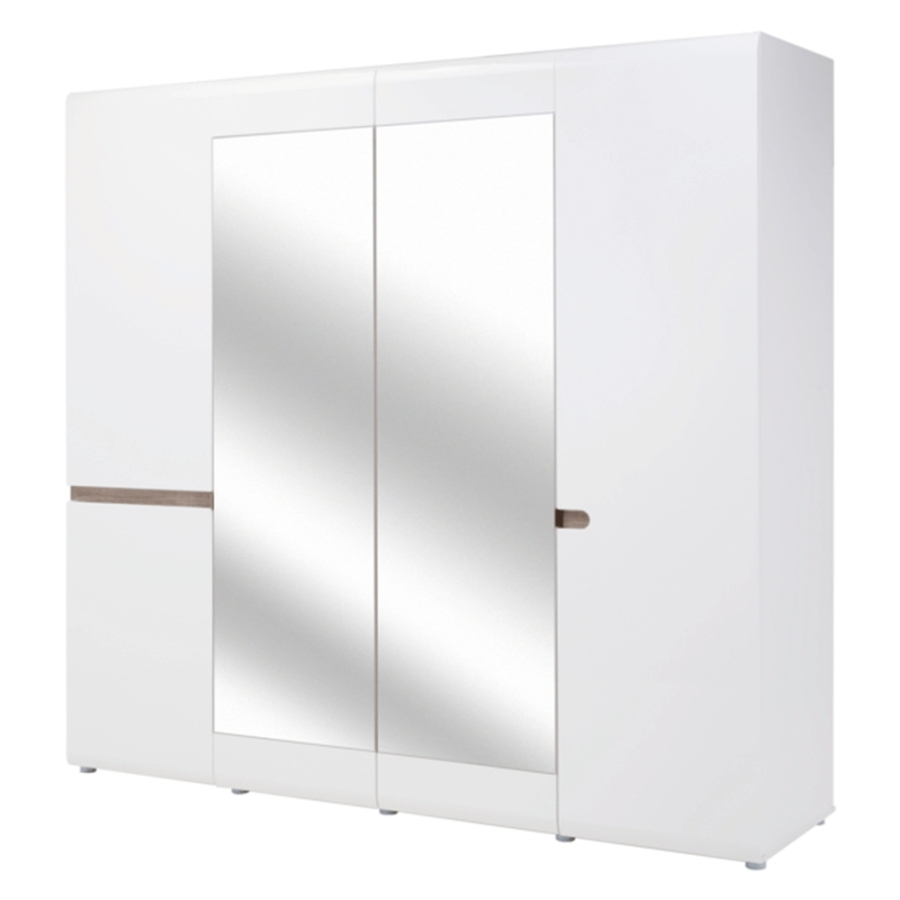 Négyajtós szekrény LYNATET 23 Változat: fehér extra magas fényű HG/ sonoma tölgy trufla Anyag: laminált DTD Modern lekerekített élek Méretek (SzéxMéxMa): 218,5x59x209 cm A váz matt kivitelben kapható Az ajtó extra magas fényű Szétszerelve szállítjuk