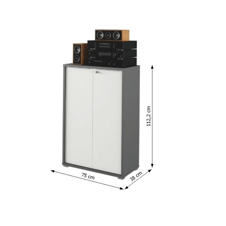 Anyaga: laminált DTD bútorlap Színe: grafit/fehér Méretek (SzéxMéxMa): 75x38x112,2 cm 22 mm vastag bútorlap Kéajtós Ajtózár 2 db polccal Fém fogantyúval Minőségi szlovák termék Lapraszerelten szállítva