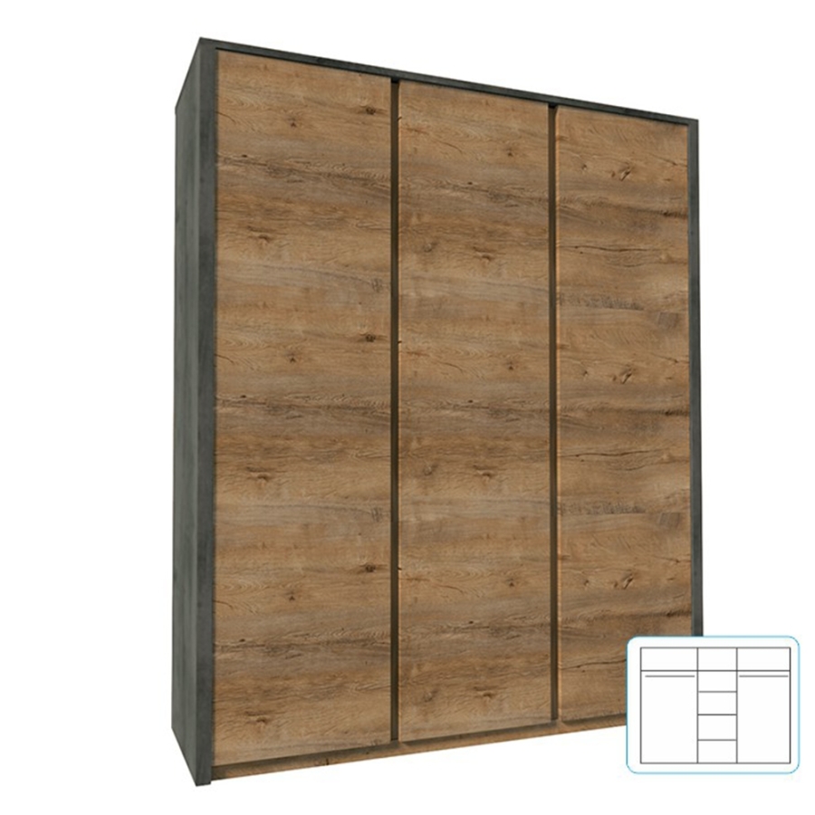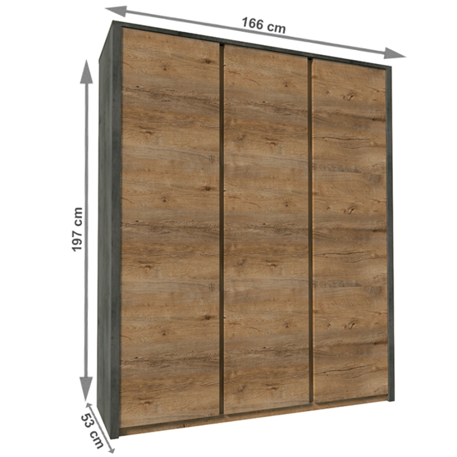 Háromajtós akasztós szekrény polcokkal MONTANA S3D Anyag: laminált DTD/ABS élek Szín: tölgy lefkas sötét/smooth szürke Méretek (SzéxMéxMa): 166x53x197 cm Szállítás szétszerelve.