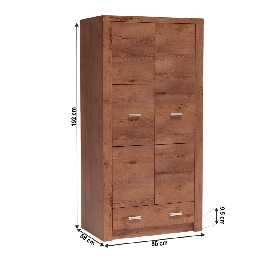 Szekrény INFINITY 01 Váz: 48 mm vastag Fém fogantyúk Anyag: laminált DTD, ABS élek Színváltozat: világos kőris Méretek (SzéxMéxMa): 96x58x192 cm Szállítás szétszerelve.