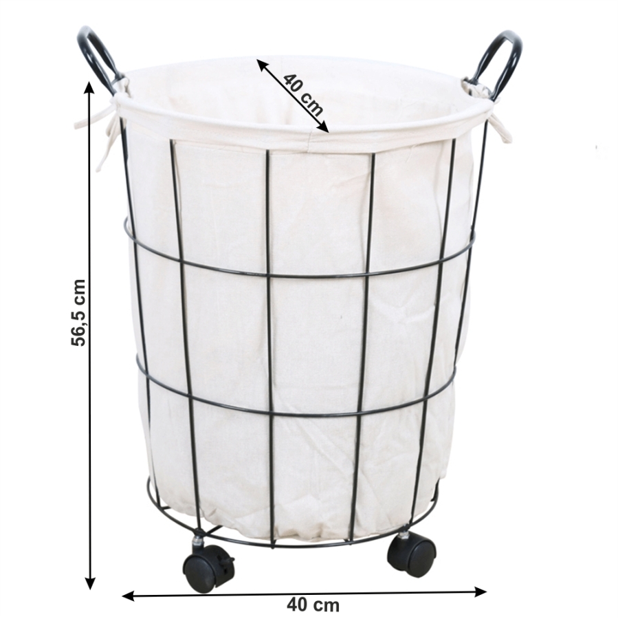 Anyag: fém/szövet Szín: fekete/fehér Méretek (SzxMéxMa): 40x40x56,5 cm Lerekekkel 2 kerék fékkel Mozgatható kosár Fogantyúkkal Összeszerelve szállítva